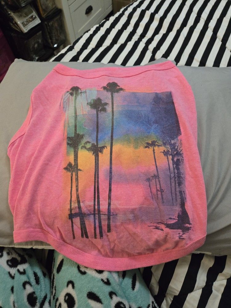 Worn 1 time. Brand: Old Navy. Type: shirt. For: dogs. Breeds: all. Size: M/L. Colors: pink overall with multicolored palm trees and sunset. Materials: acrylic. Season: summer. Very cute and comfy!