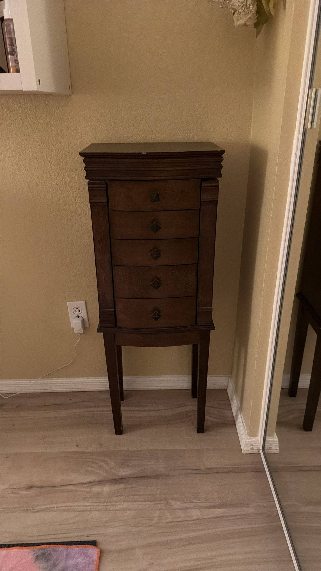 A few chips, has mirror, ring holders, two sides for necklaces & five drawers. Has lasted me over ten years & ready for the next person!