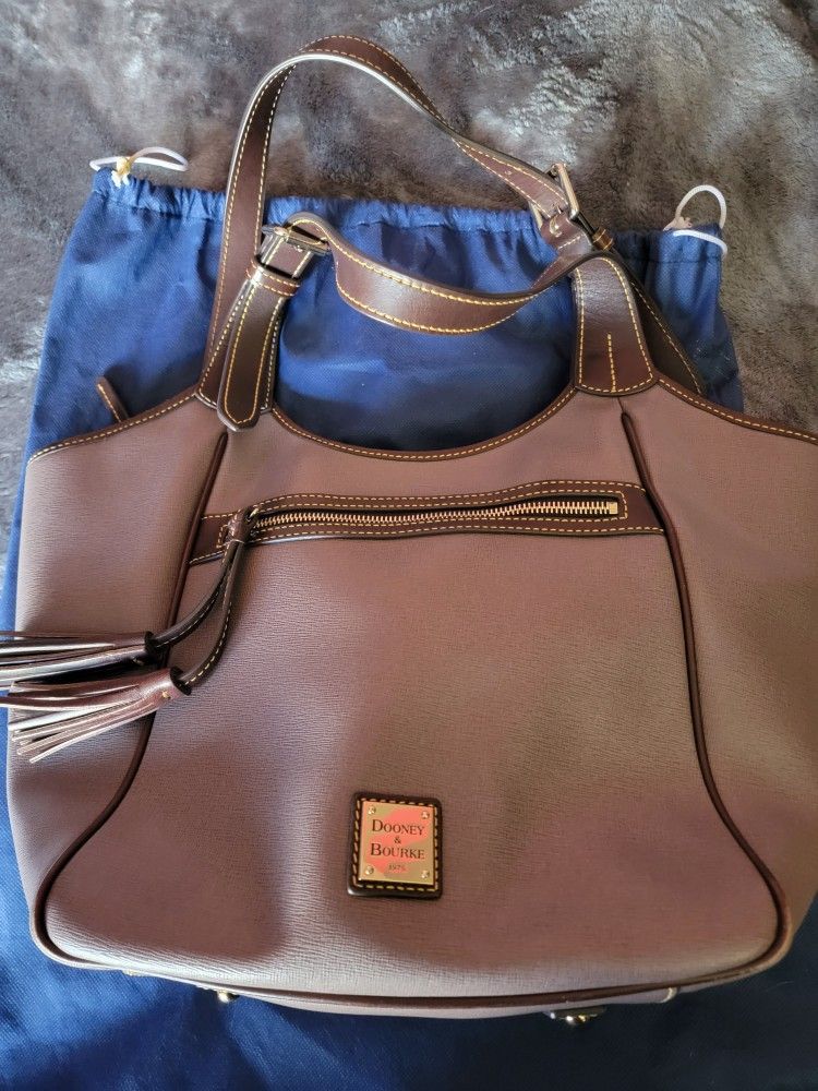 Taupe with red interior. Lightly used with small stain on interior liner. Shown in picture. Otherwise looks brand new. Tassle accent on front pocket zipper pull. Includes original dust cover