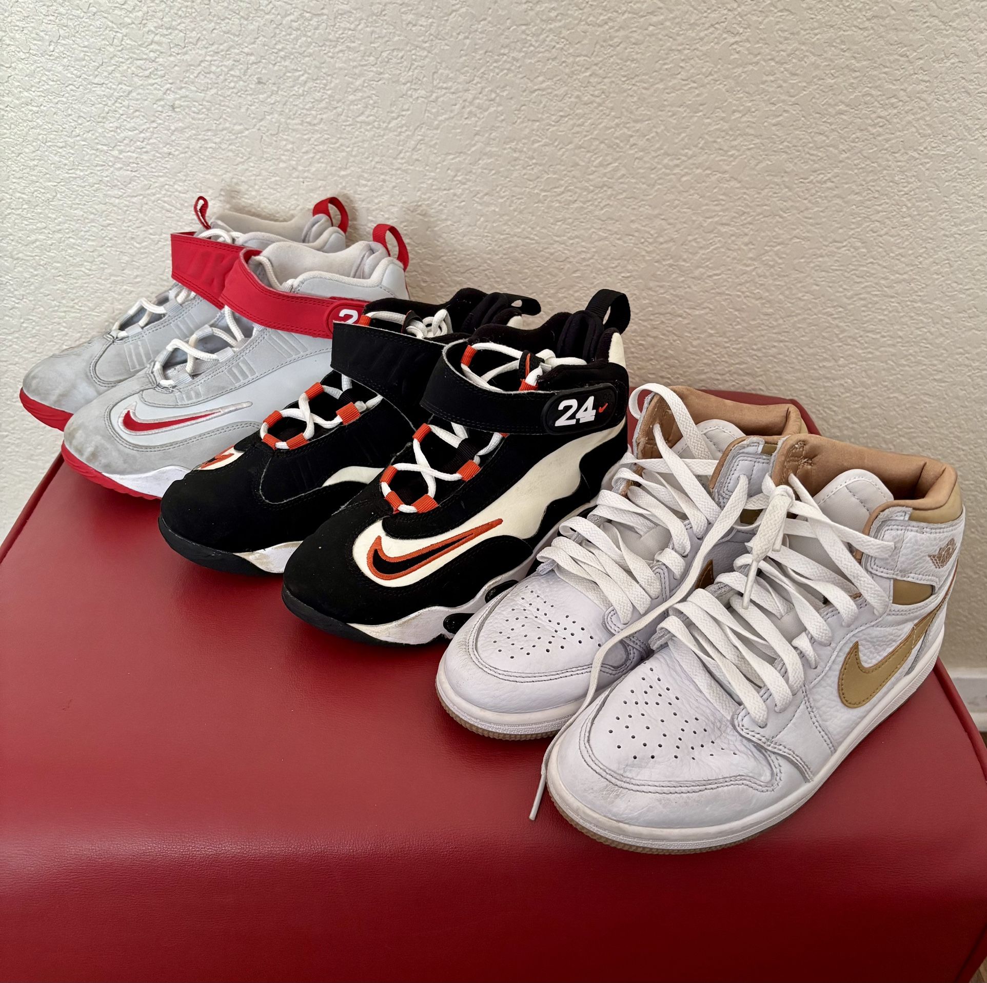 Used in good condition — clean and well kept. No box. All size 3Y. 1️⃣ Air Jordan 1 Retro High White-Metallic Gold FD2597-107 Kids Size: 3Y 💰$50 2️⃣ Nike Air Griffey Max 1 ~San Francisco Giants~ DZ5281-100 Kids size: 3Y 💰$30 3️⃣ Nike Air Griffey Max 1 Kids size: 3Y 💰$20 🎉Take all 3 for $80🎉