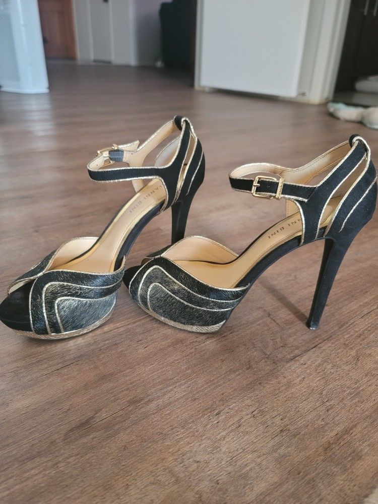 Very nice Gianni Bini black & gold heels. They have fur. Almost like new. Hardly used. Almost 4in high. Reg price was over $100. I am askin $60 obo