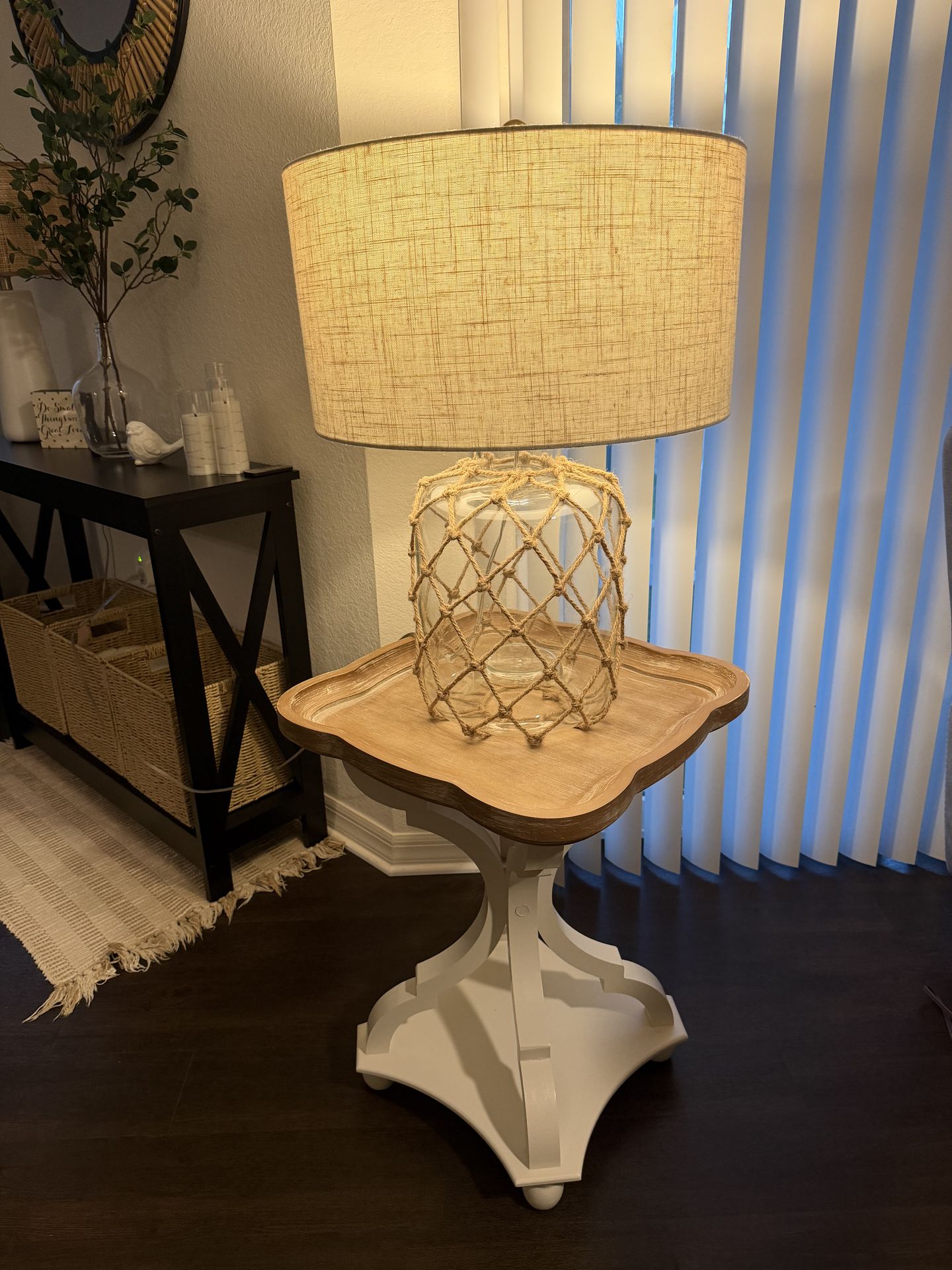 Great condition!!! Lamp and wooden table (costal deco) table height 25”