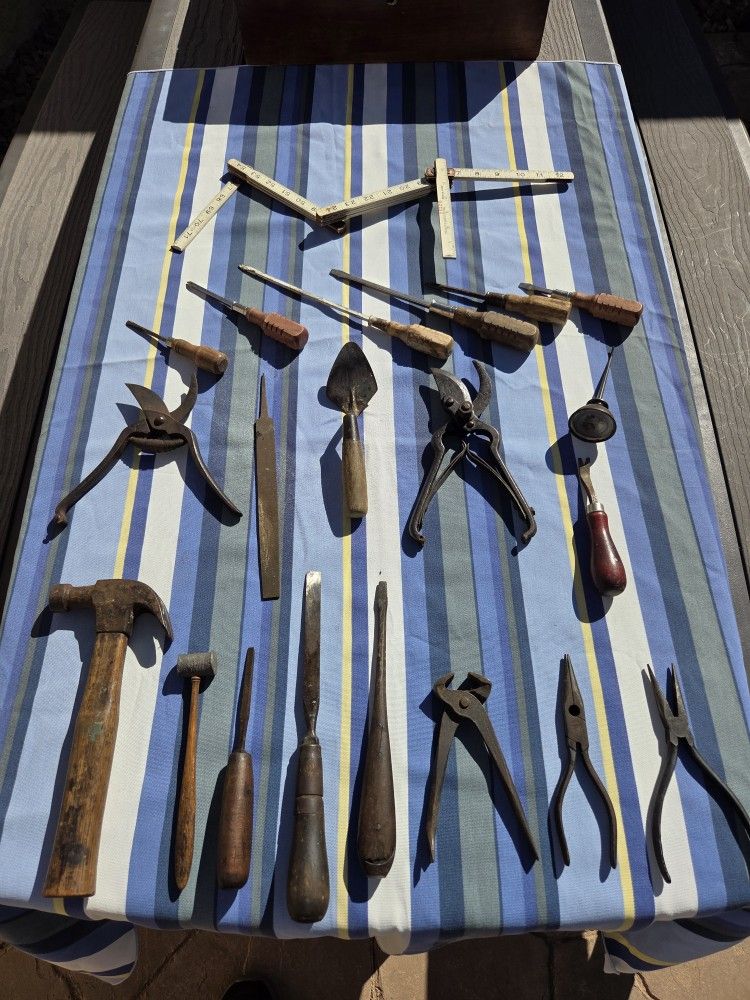 Vintage Wooden Toolbox + Approx 20 Hand Tools (Hammers, Shears, Screwdriver, Folding Ruler, Chisel. Etc.) - Rustic $250 OBO
