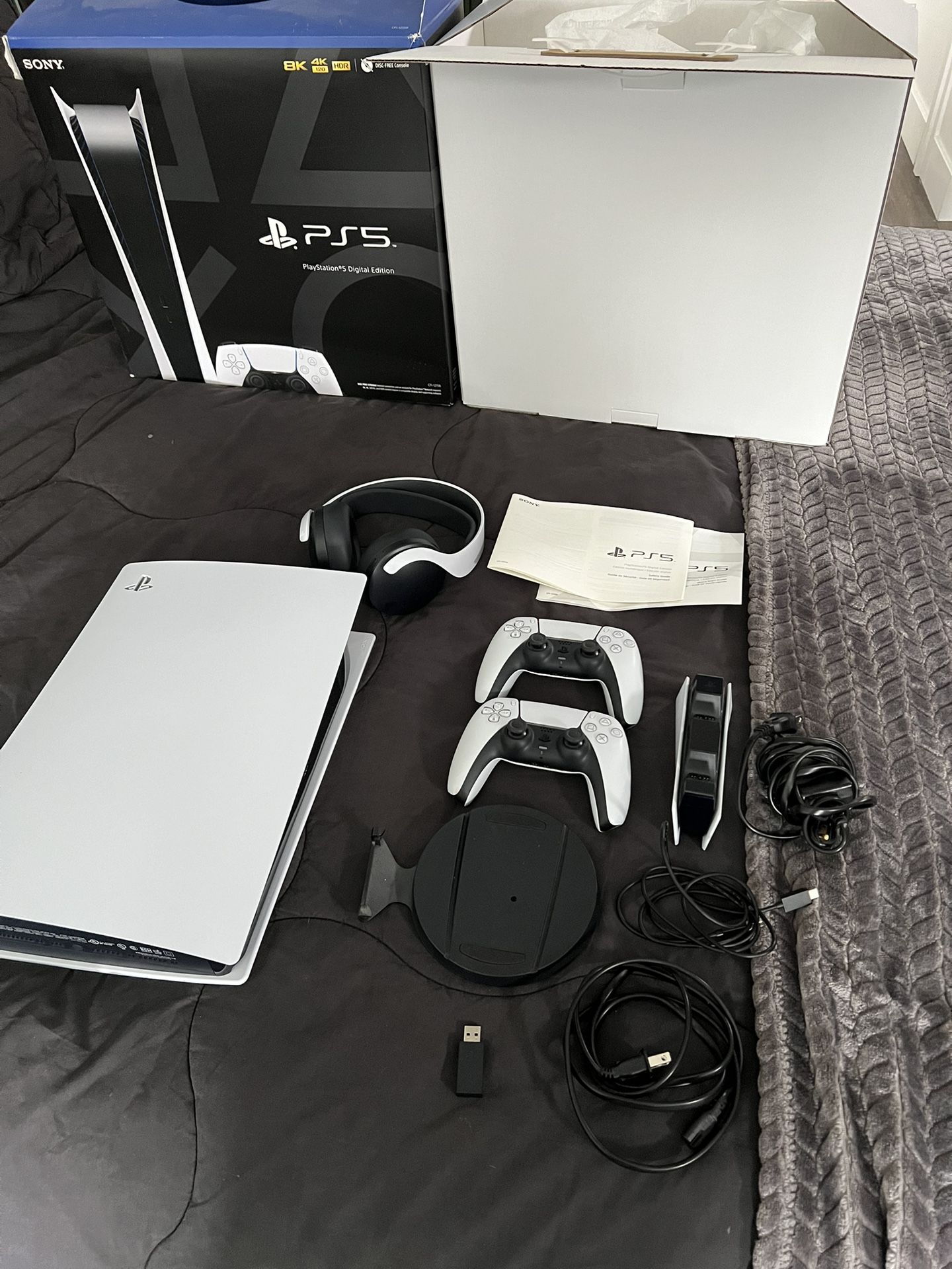 Practically brand new PS5 with 2 controllers, charging stand, and headset. Everything is super clean and hardly used. PS5 has been factory reset. Both controllers work perfect and are great condition. Headset also practically brand new. Come with everything pictured. Includes original packaging.