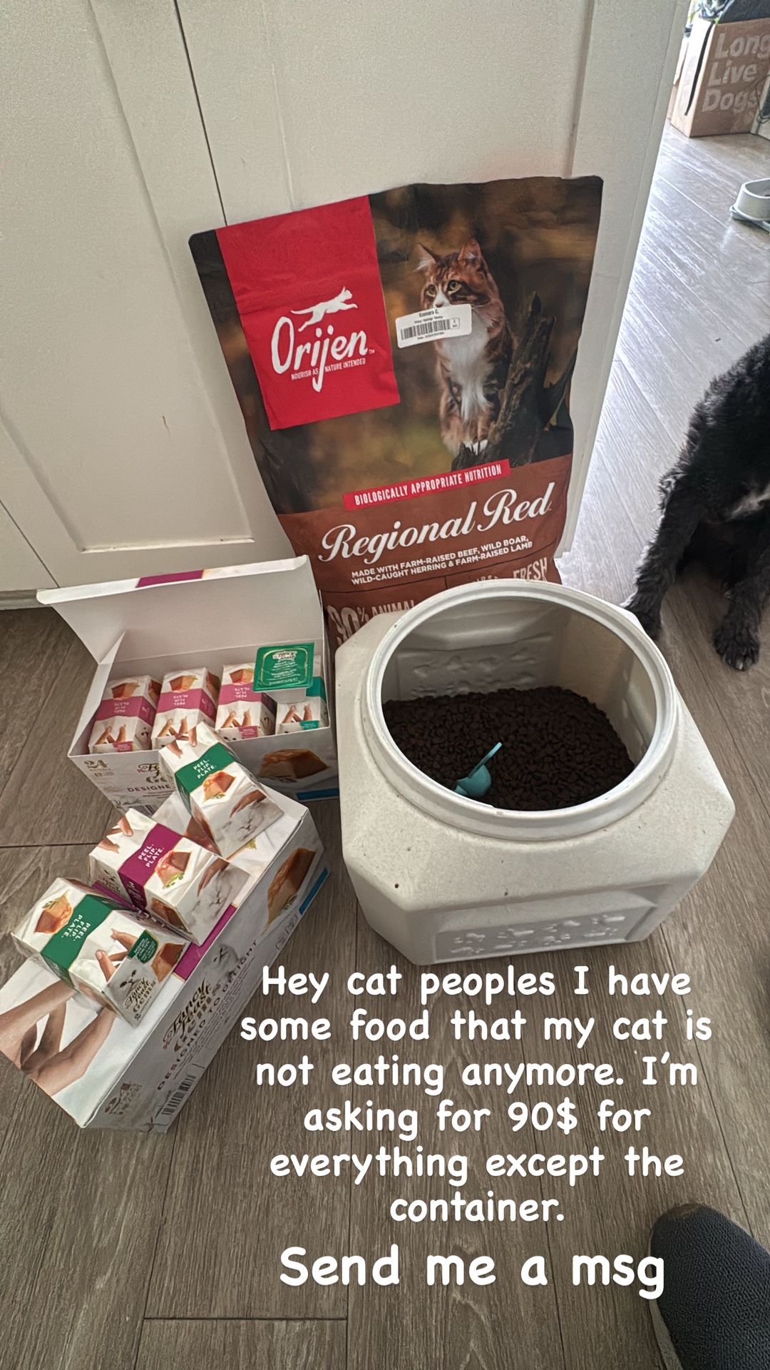 I have a full bag of Origen cat food 2 packs of 24 entrees of fancy feast Gems. And one open bag of Origen cat food