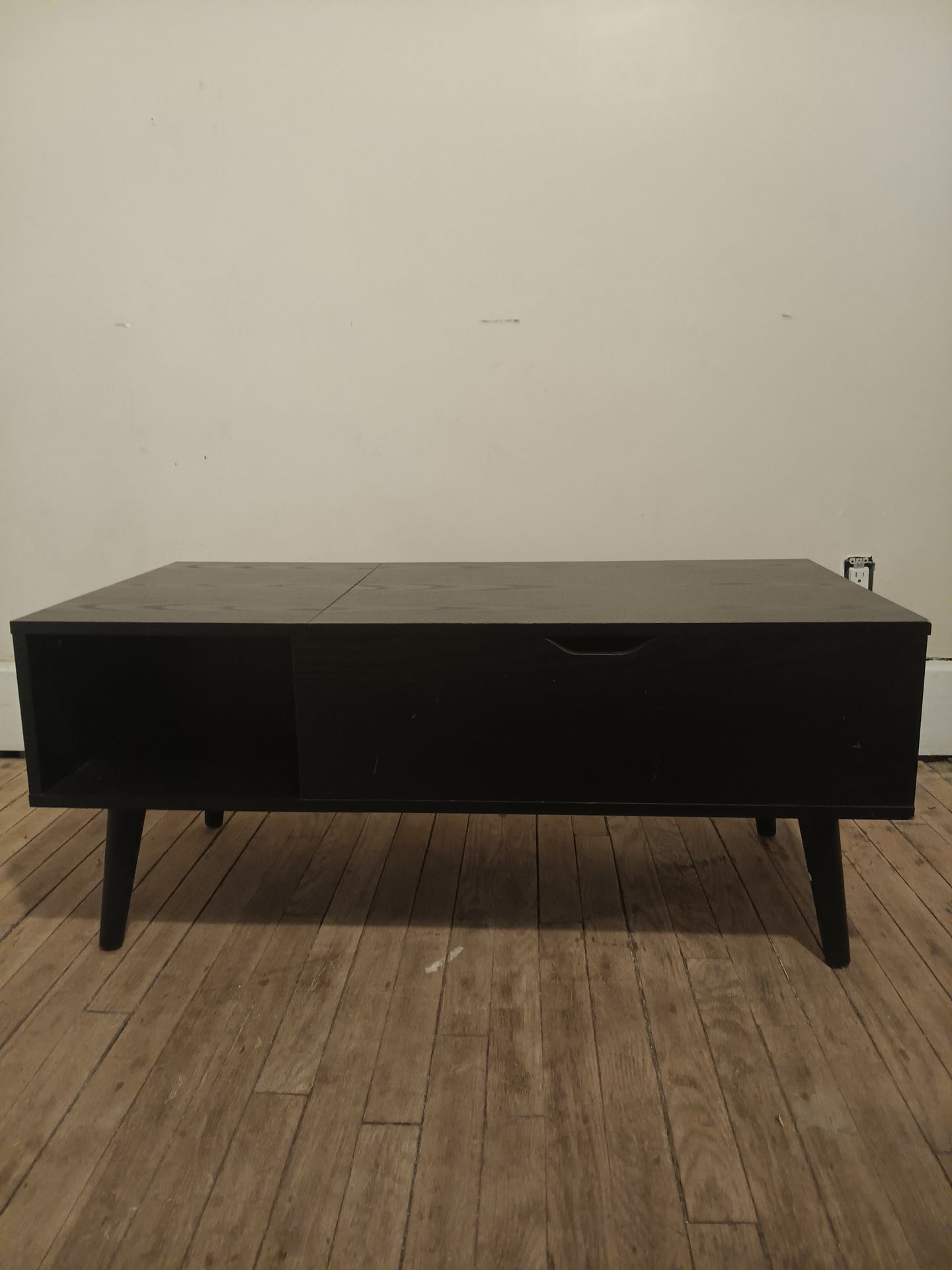 A Black coffee table that is made from wood, with an inside storage space, under the lifting table top. There are some scratches I showed in the pictures.
