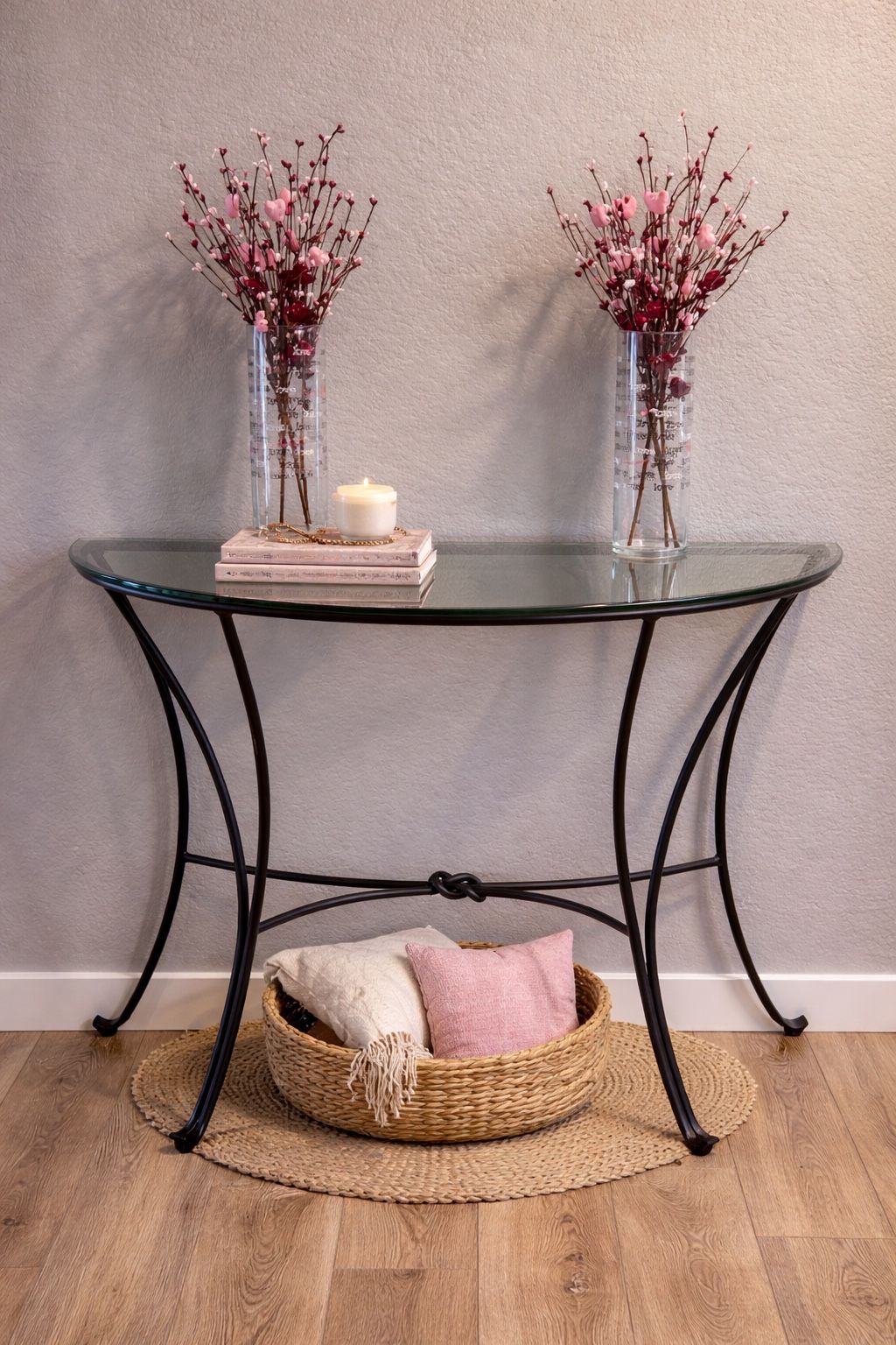 Pier One Knot Iron Base Half Moon Console Table With Glass Top Height: 30" Depth: 16" D Width: 40" W Decor not included.