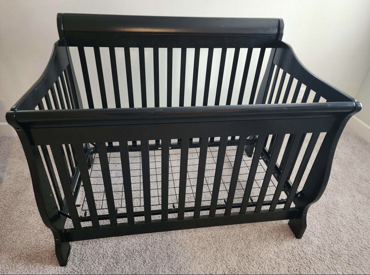 Black color Wood material Turns into toddler bed Good condition, well taken care of