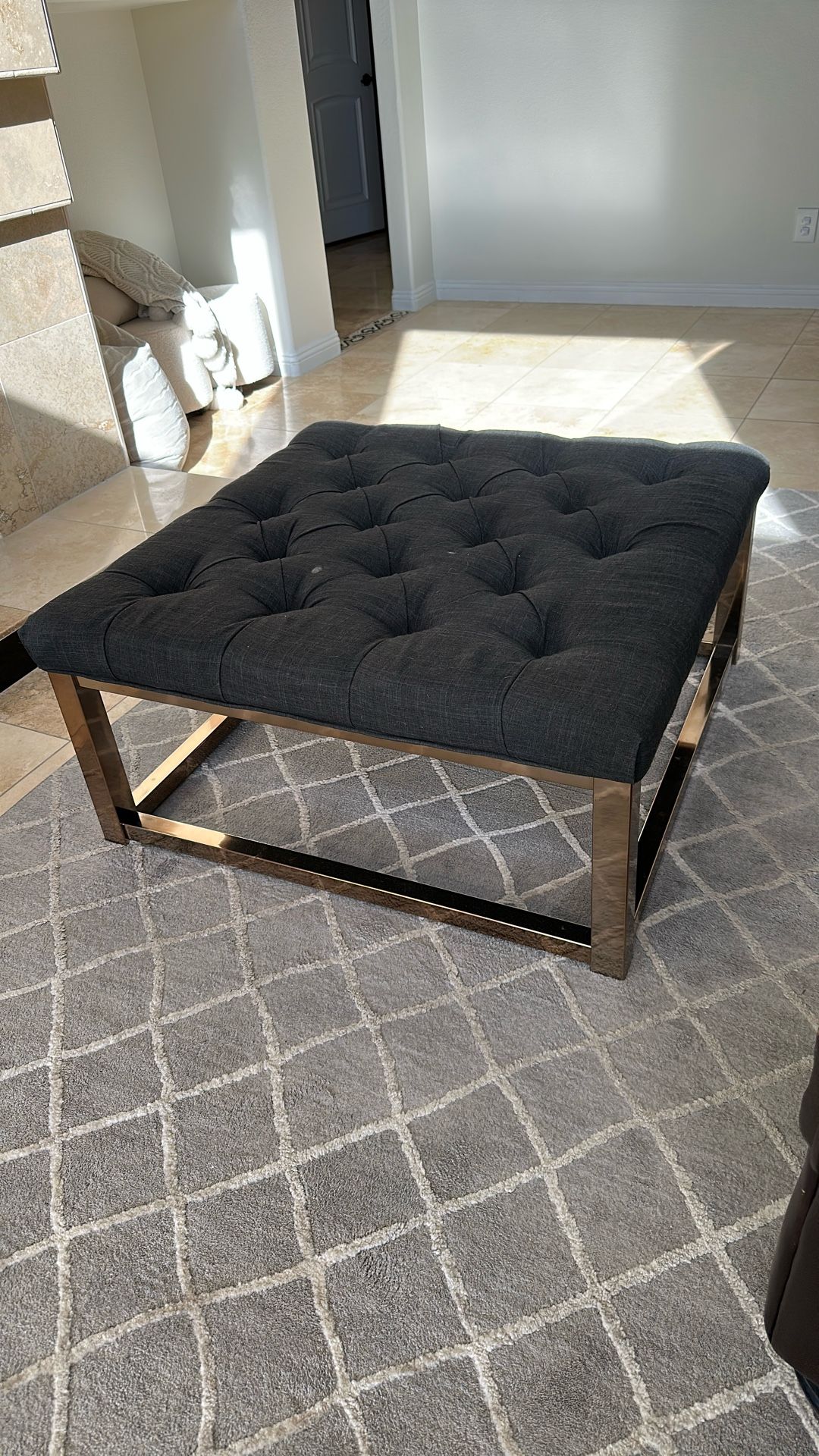 This is a Solene Square Ottoman Coffee Table by iNSPIRE Q Bold with a dark grey linen, button-tufted top and a champagne gold finish base. Delivery is possible for a small fee, depending on where you live, and after the item is purchased. Located off of 28th St. and Chandler Boulevard in Ahwatukee.,