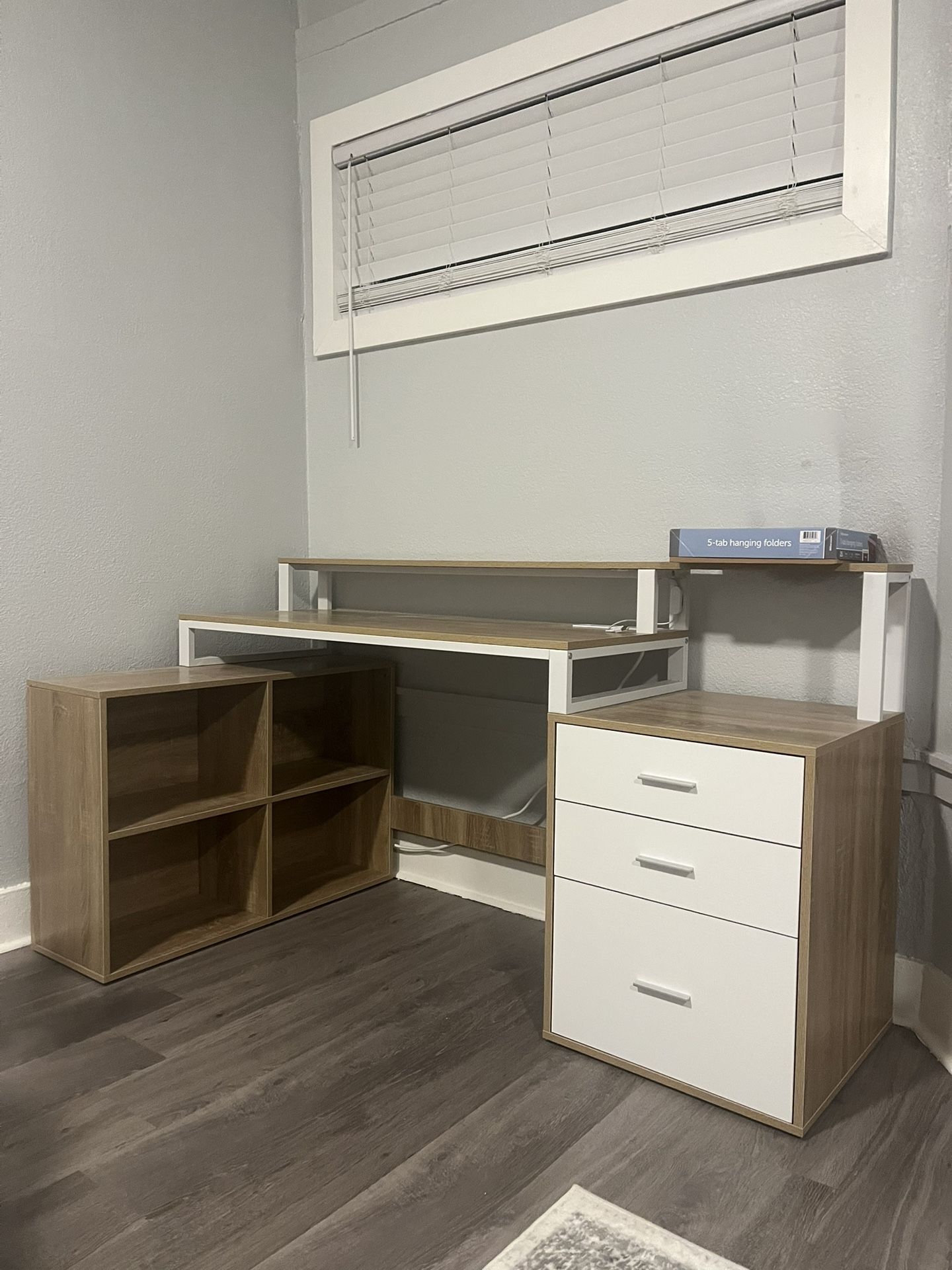 Dimensions in third photo. Moving and do not have space for this desk. Drawers are deep and filing drawer can be adjusted to regular or legal sized folders. Box of remaining regular hanging folders included with desk.