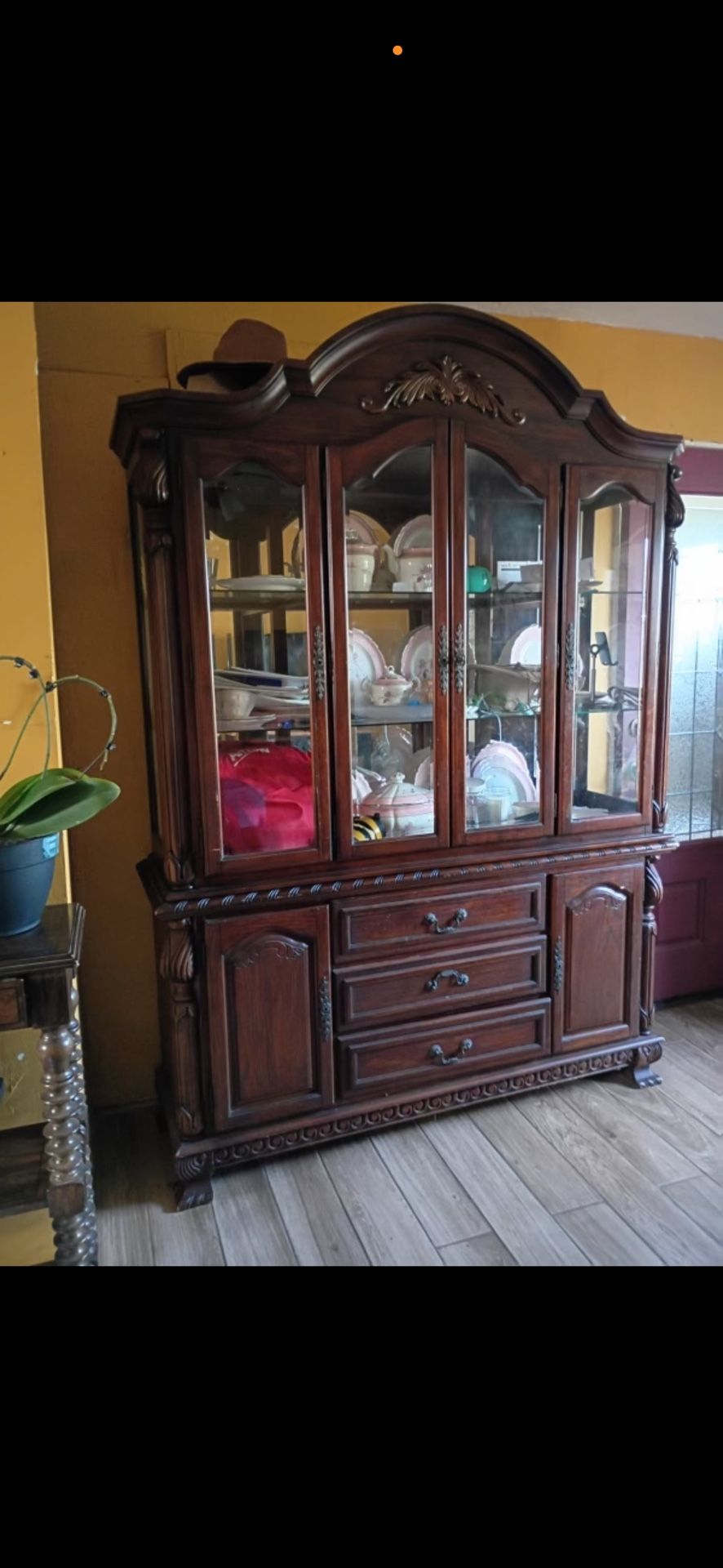 Beautiful vintage china cabinets in cherry oak wood has a top cabinets with two glass shelves and 4 unique doors, 3 bottom drawers, and two bottom cabinets in perfect condition and kept very clean over the years! I’ll be adding more pictures over the weekend to show the condition up close😊 Price is negotiable and free delivery is available depending on the location