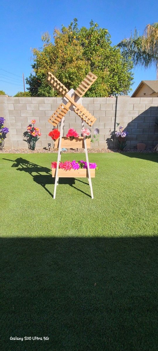 Cedar windmill with planter boxes Boxes and blades slide in/out Blade spins and is removable for transport 6 1/2 feet tall Fake flowers are not included
