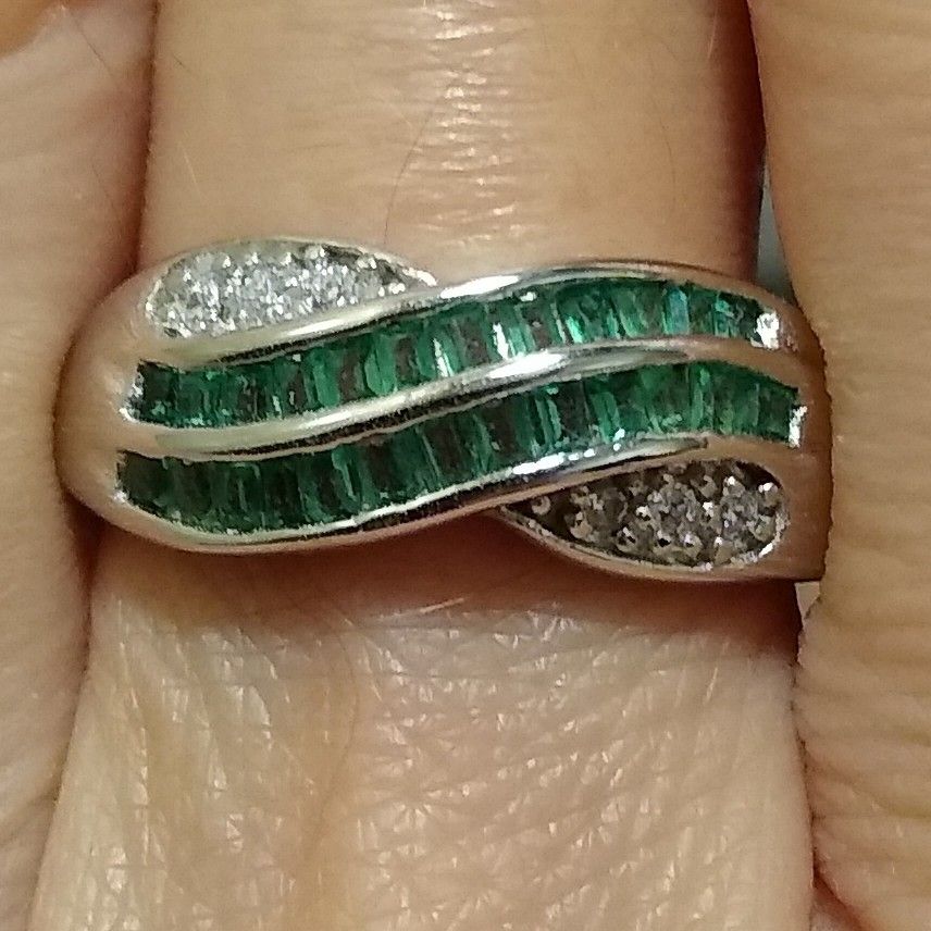 Up for sale is this very beautiful new stamped 925 solid sterling silver ring SIZE 8 with gorgeous baguette style stones set into the band with beautiful lab-created green π Sapphires and white π€ Sapphires in kind of a criss-cross pattern. It's very beautiful in person! From our smoke-free home. Pictures shown in different types of lighting.