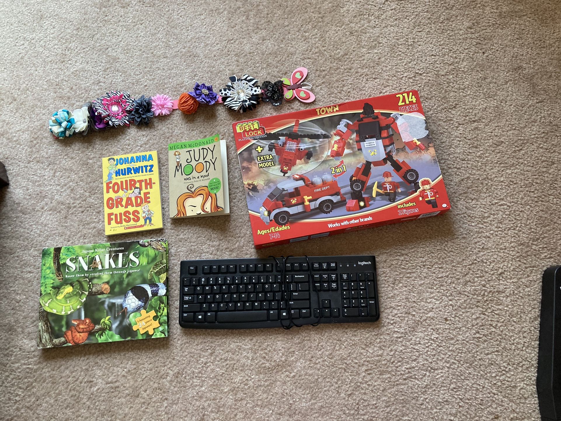 Toys Working keyboard Bows Books New Lego set ALL for $15 FIRST COME FIRST SERVE Check out my listings