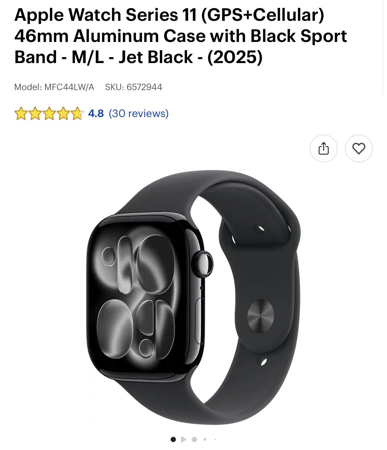 Apple Watch Series 11 (GPS+Cellular) 46mm Aluminum Case with Black Sport Band