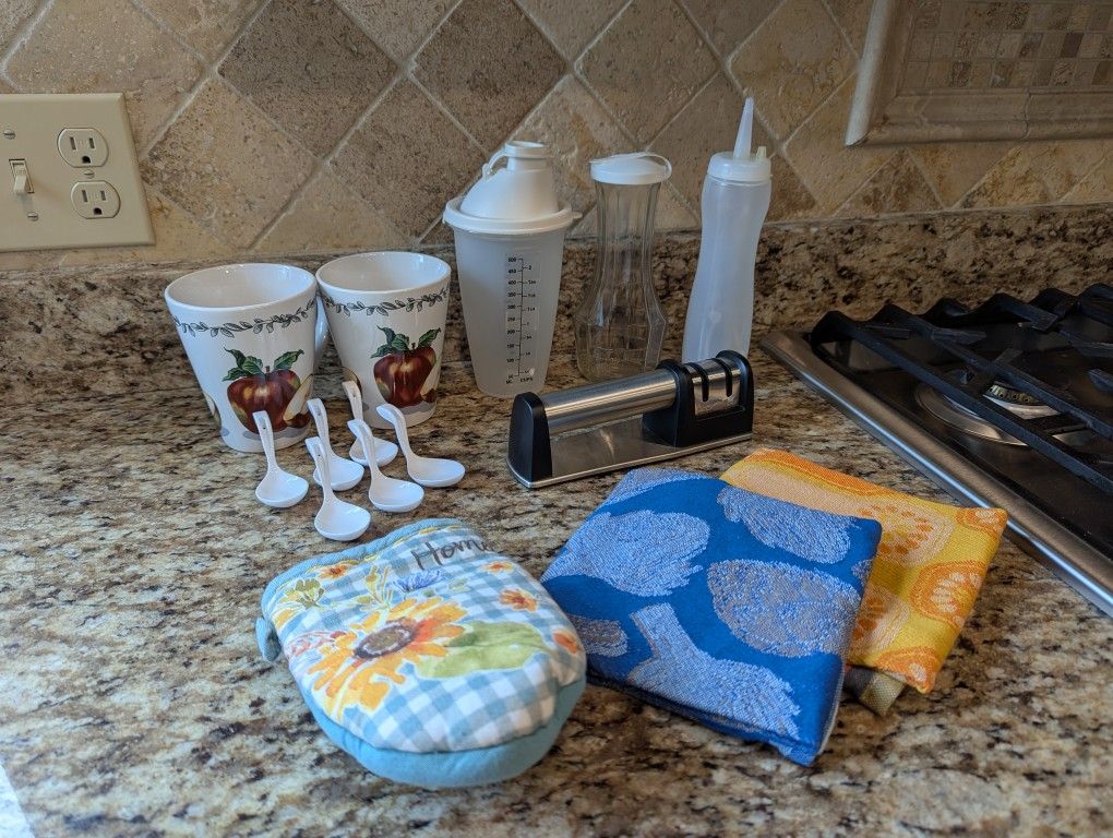 A variety of kitchen accessories - Mugs, Dressing Bottles, Oil Dispenser (plastic), Appetizer Tasting Spoons (plastic), Knife Sharpener, Hot Mit, Tea Towels. Also check out the other items I have listed.