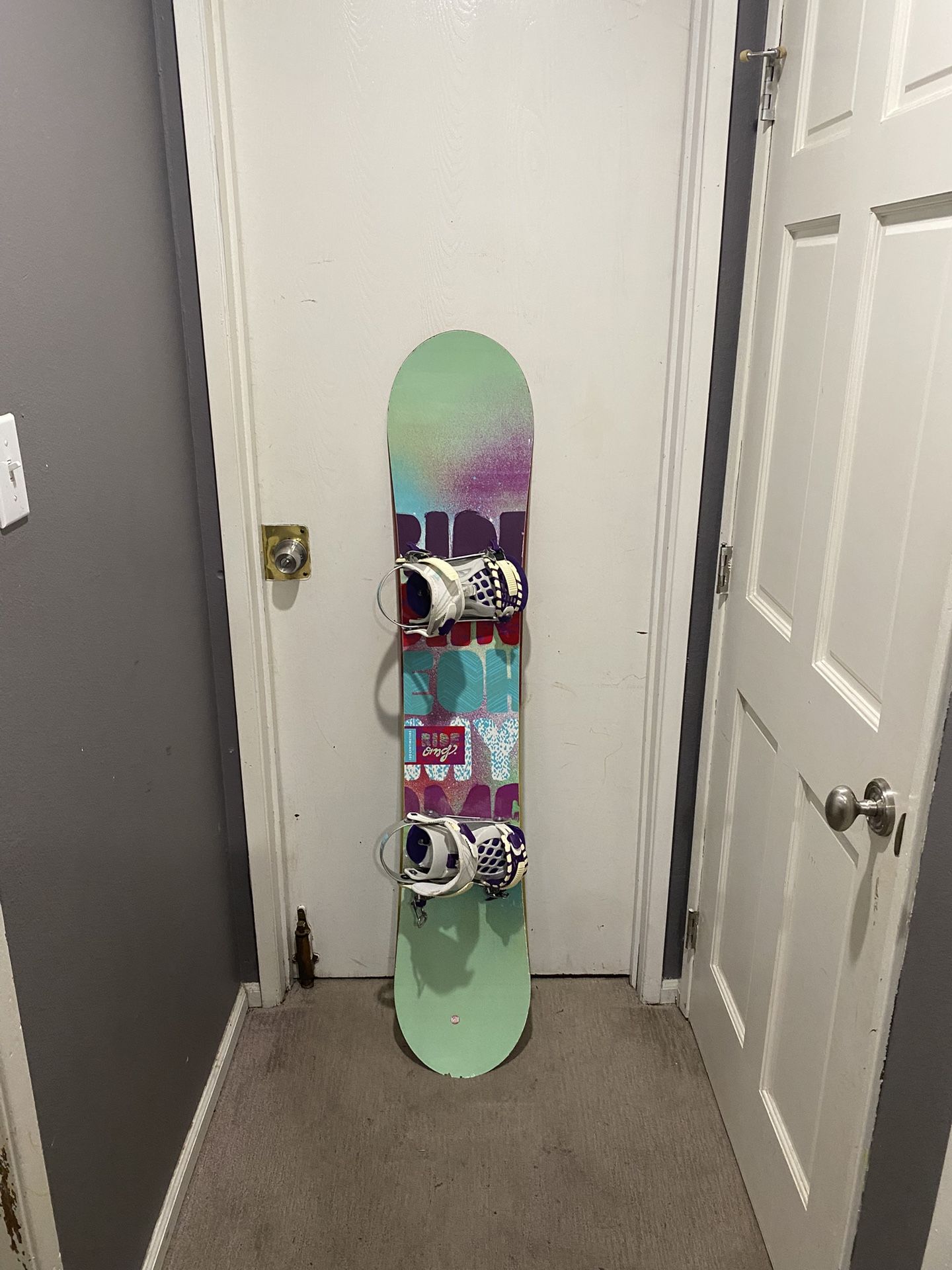 In good condition. The snowboard and bindings had been used for several seasons. But still have plenty of life left, especially for beginners. The snowboard has some minor scratches and some chips as shown on the last photo. The bottom of the board is in great condition. The binding straps works well. The bindings do have some minor cosmetic wear. The brand of the bindings are Ride. The size of the bindings are medium. The brand of the snowboard is Ride. The size of the snowboard is 150cm.