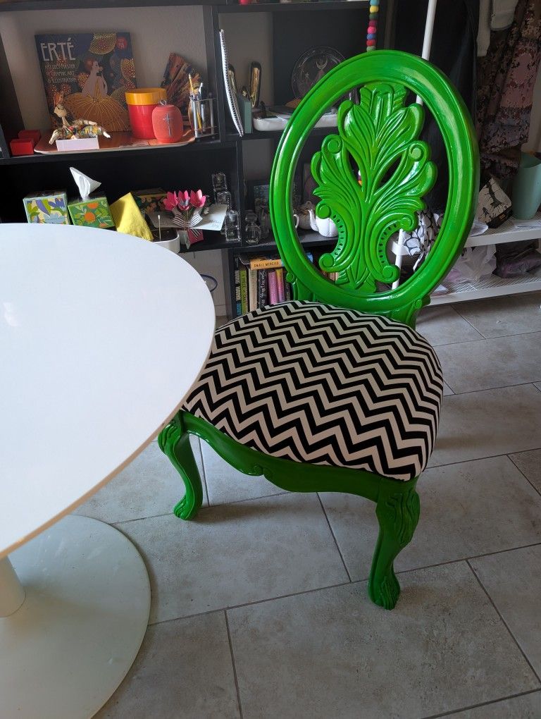 Upcycled lime green chair with Chevron fabric seat. 25 inches wide and 21 inches depth. 42 inches high. It's a heavy chair Cash only Shea and 101 Scottsdale If the ad is up it is still for sale