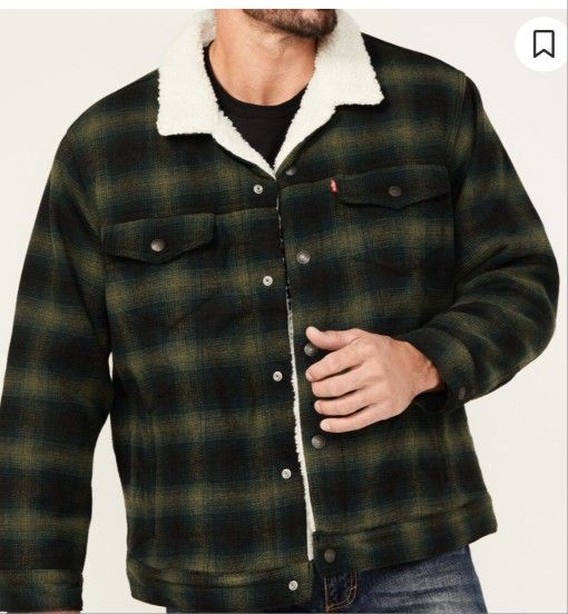 Relaxed sherpa trucker jacket Size Large 100% polyester ; Sleeve Lining: 100% polyamide Spread sherpa collar Long sleeves Snap placket, pockets and cuffs Two single-point flap pockets on chest with snap closures Green plaid print Two welt hand warmer pockets Sherpa lining Imported Style: A6030-0003