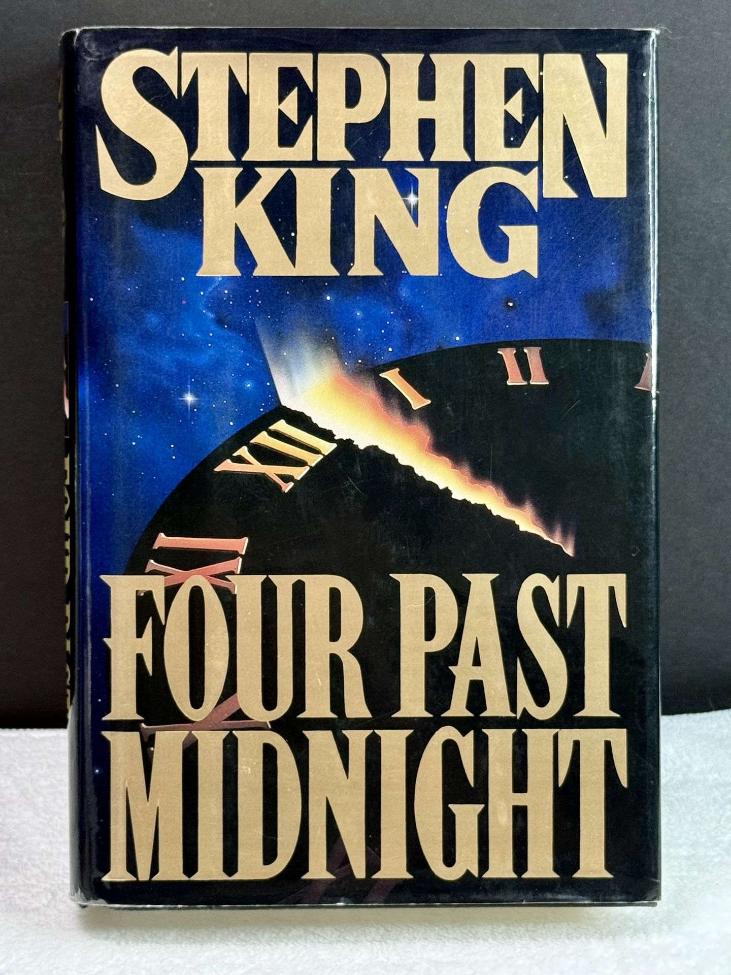 Four Past Midnight is a novella collection by Stephen King, published by Viking in 1990. This hardcover edition includes four long-form stories blending suspense, psychological horror, and supernatural themes. This is a first edition, first printing (full number line present). The book retains its original dust jacket and black cloth boards with gilt lettering. Interior pages are clean and fully readable, with no missing pages noted ✅ Condition: Very Good • Dust Jacket: Present; shows general shelf wear, light edge wear, and surface scuffing • Boards: Very good; corners sharp with minor wear • Spine: Straight and tight • Pages: Clean and intact; mild age toning consistent with year • Binding: Solid ✅ Details: • Title: Four Past Midnight • Author: Stephen King • Publisher: Viking (Penguin Group) • Year: 1990 • Edition: First Edition / First Printing • Format: Hardcover with Dust Jacket • ISBN: 0-(contact info removed)8-2 • Printed in: USA