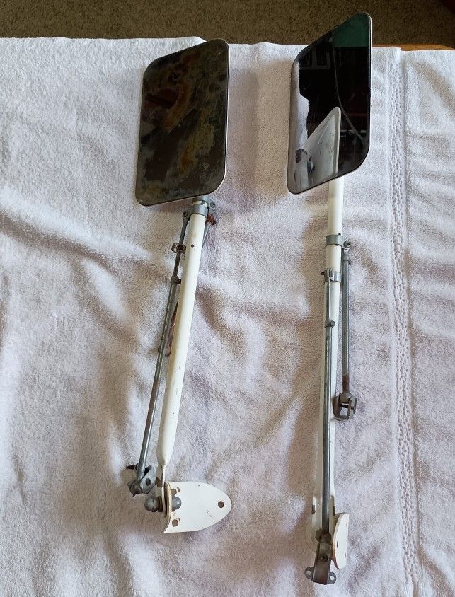 Vintage Ford 1960s Towing Mirrors in "As Is" condition. The mirrors will need to be replaced as one is cracked and the other is foggy. The mirrors are rectangular in shape. The longer of the 2 arms is missing a bracket. They are known to fit classics like F-100, F-250, Bronco II, etc ... Selling as a set Measurements Larger one L = 26.75" Mirror length = 8.50"; width = 5.75" Smaller one L = 24.25" Mirror length = 8.50"; width = 5.25"
