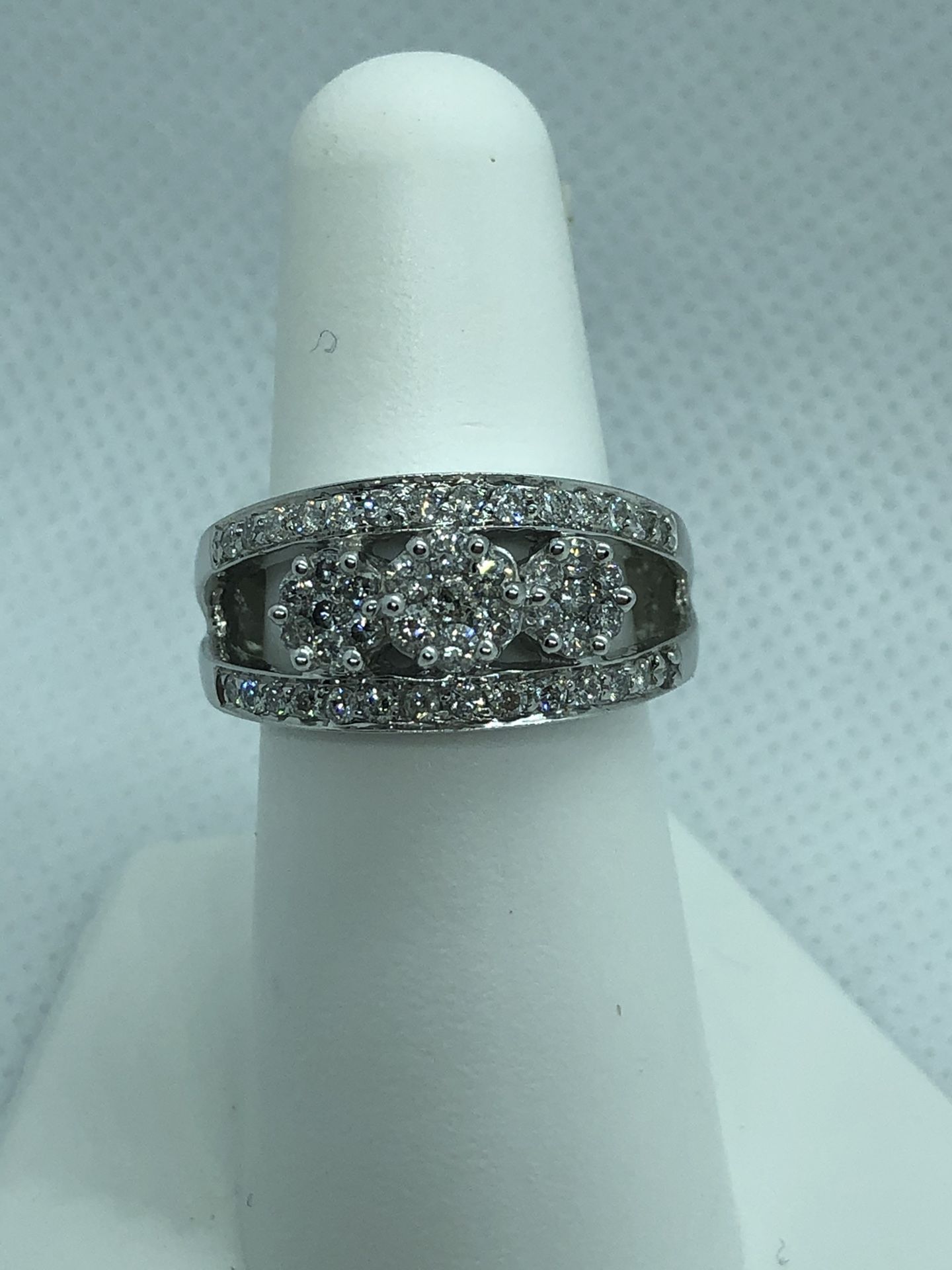 14k white gold with 3 diamond clusters and 2 rows of pave diamonds. $1000 Serious inquiries only please. Re-sizing options available. Shipping available, face to face sale preferred. Cash, Venmo, Zelle or PayPal accepted.