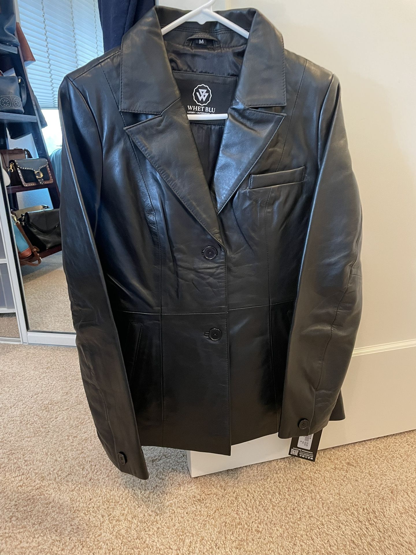 Whet Blue brand black leather jacket. Size medium. $225 at Macys. Never worn, new in plastic.