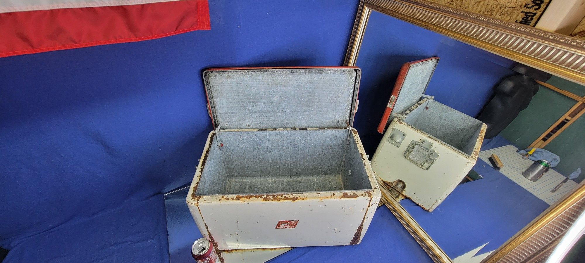 VINTAGE INSULATED STEEL ICE CHEST. Great for roof rack or truck bed art. Still keeps cold. $65 OBO