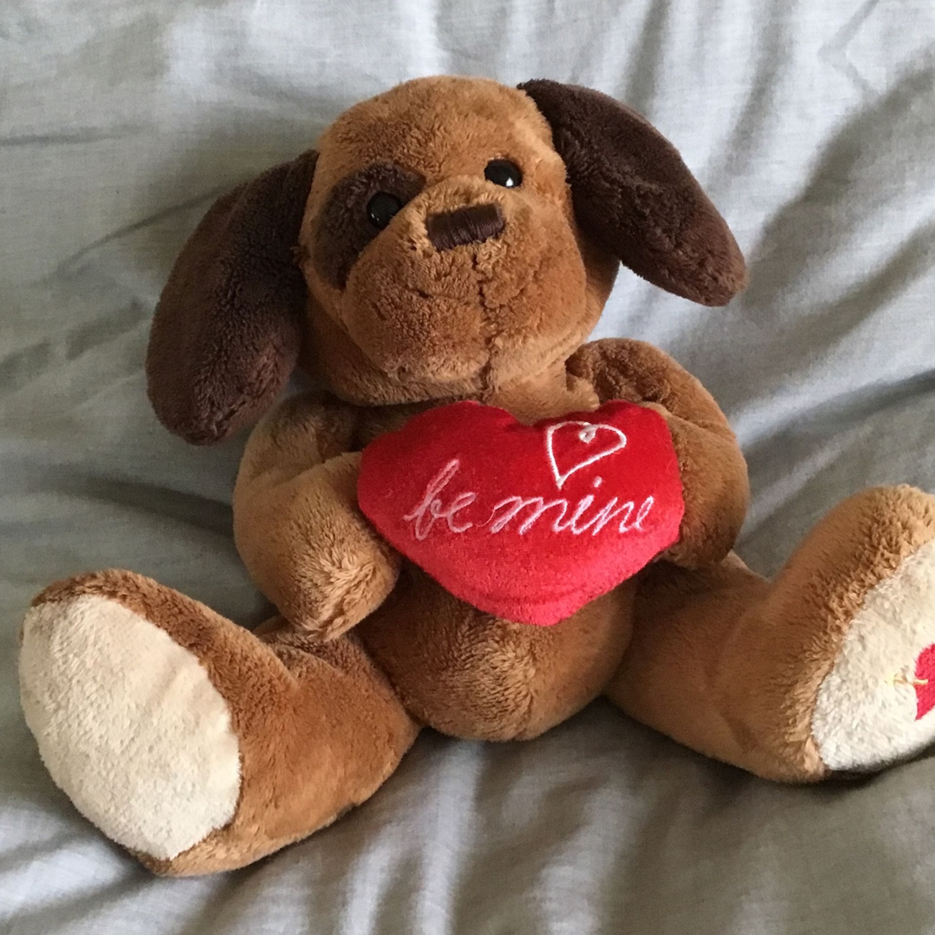 Cute toy dog with heart that says “be mine”