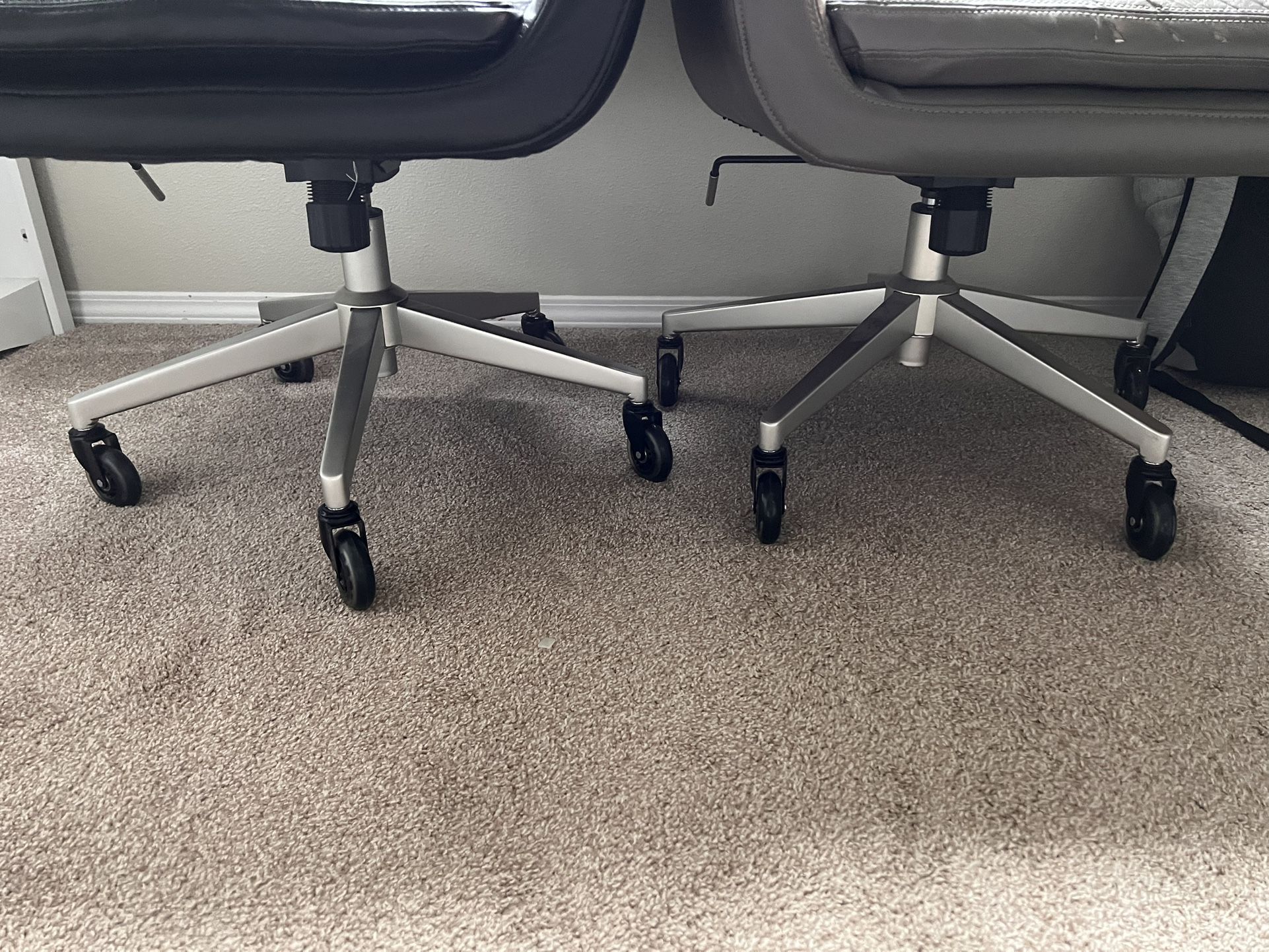 Two Serta SitTrue Montair Faux Leather Mid-Back Manager Chairs. These are lightly used, one is black and one is gray. There are no holes or scratches in the fabric. Each chair is in proper order and has complete functionality. The cheap plastic wheels have been replaced with heavy duty rubber casters. The chairs are being sold for $100/each OBO.