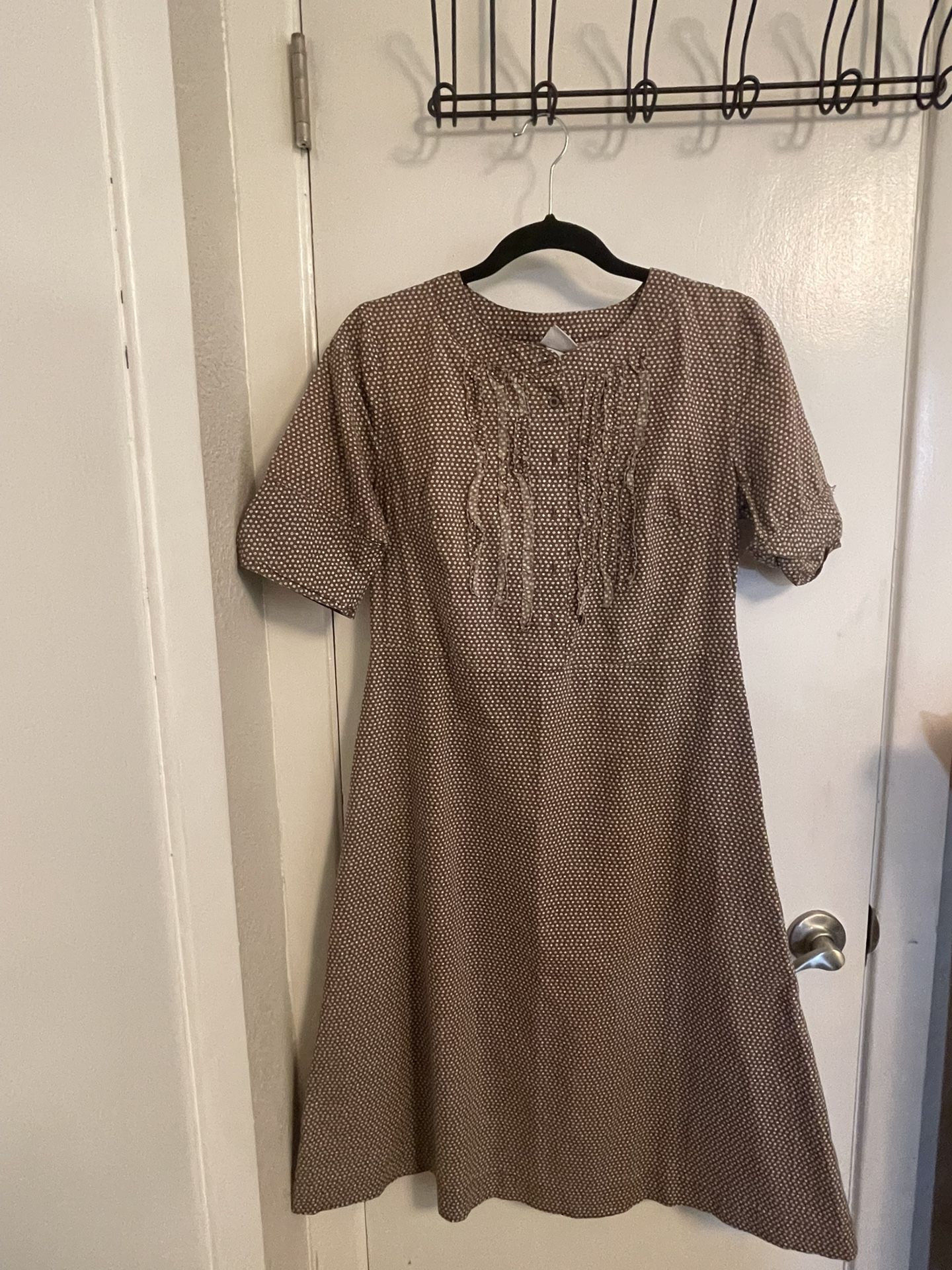 • Small white polka dots • Short sleeves • 3/4 length • Feels like a shift dress • Color: Tannish-light brown
