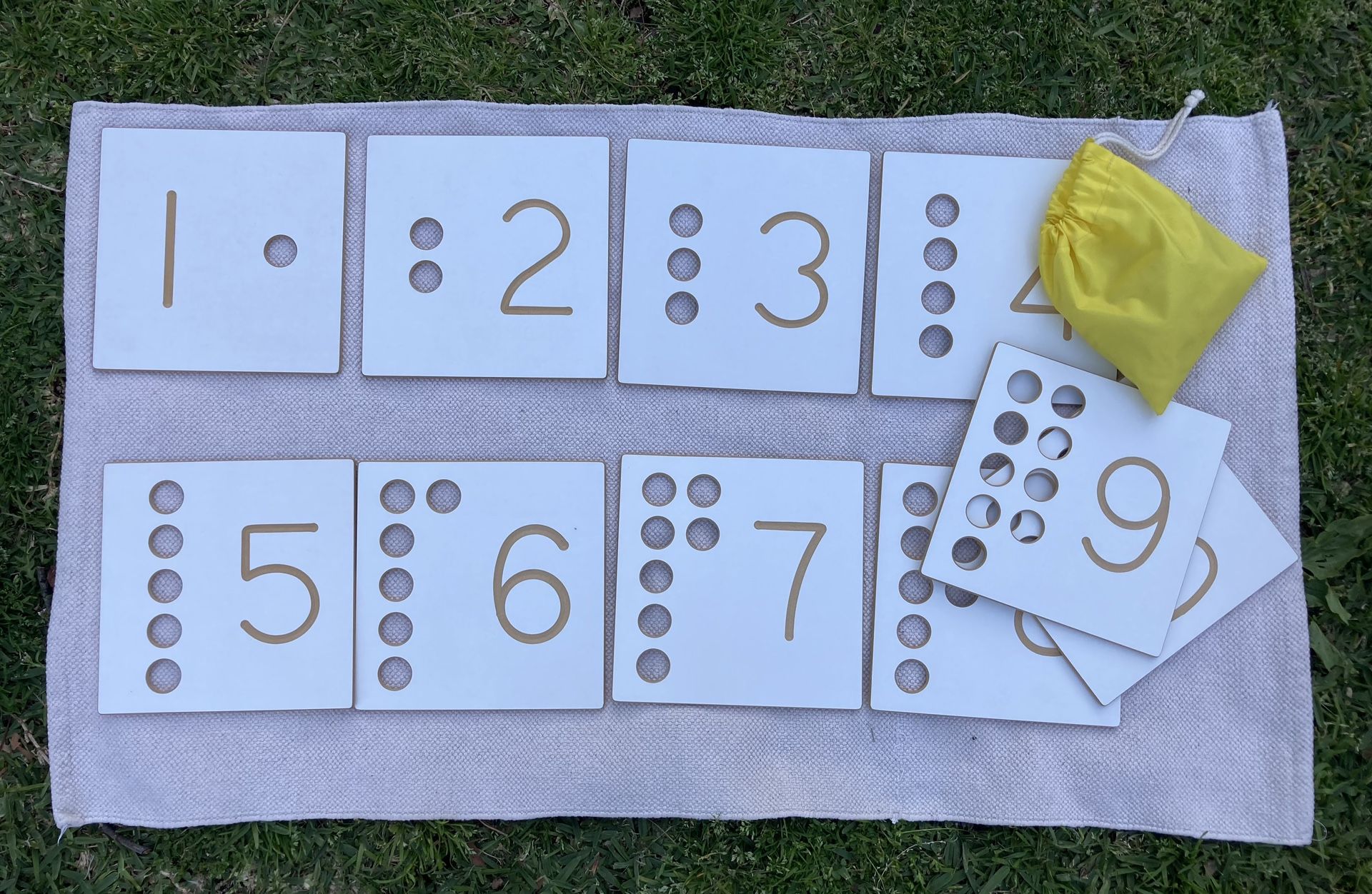 Like New! This wooden toy is an excellent educational toy that will keep your 2-4 year old entertained while learning to association pegs with numbers. The child selects a number card and fills the holes with the pegs. They then pull the knob and the pegs come tumbling down. This material includes the base, 10 wooden cards, complete set of pegs and original bag to store pegs.