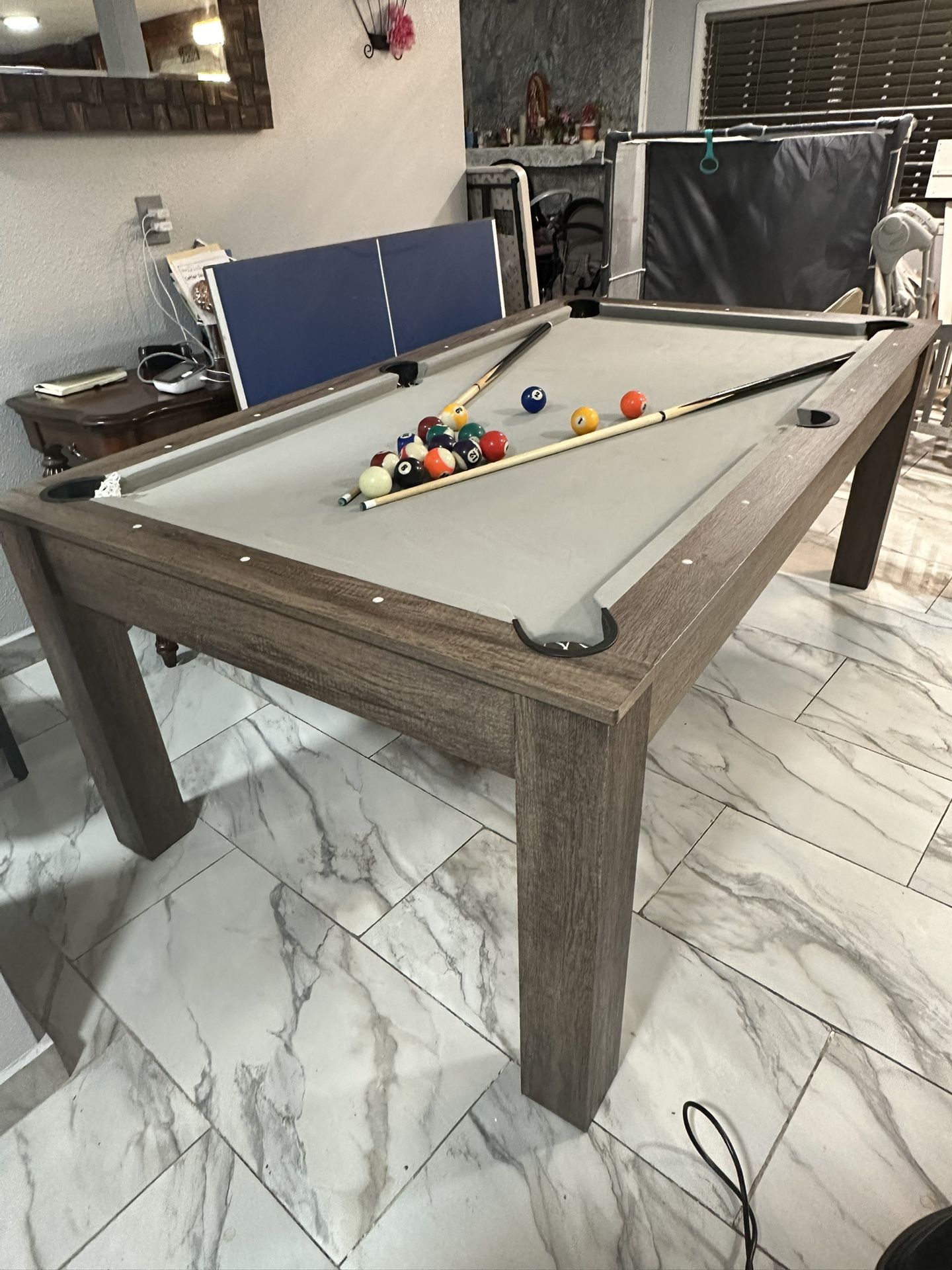 7’ foot combo table Top flips over for reg table or table tennis. Cue sticks and billiard balls included. Has 2 little scratches on the pool table. But overall good condition. 84” length 47” width 32.5” height Pick up only