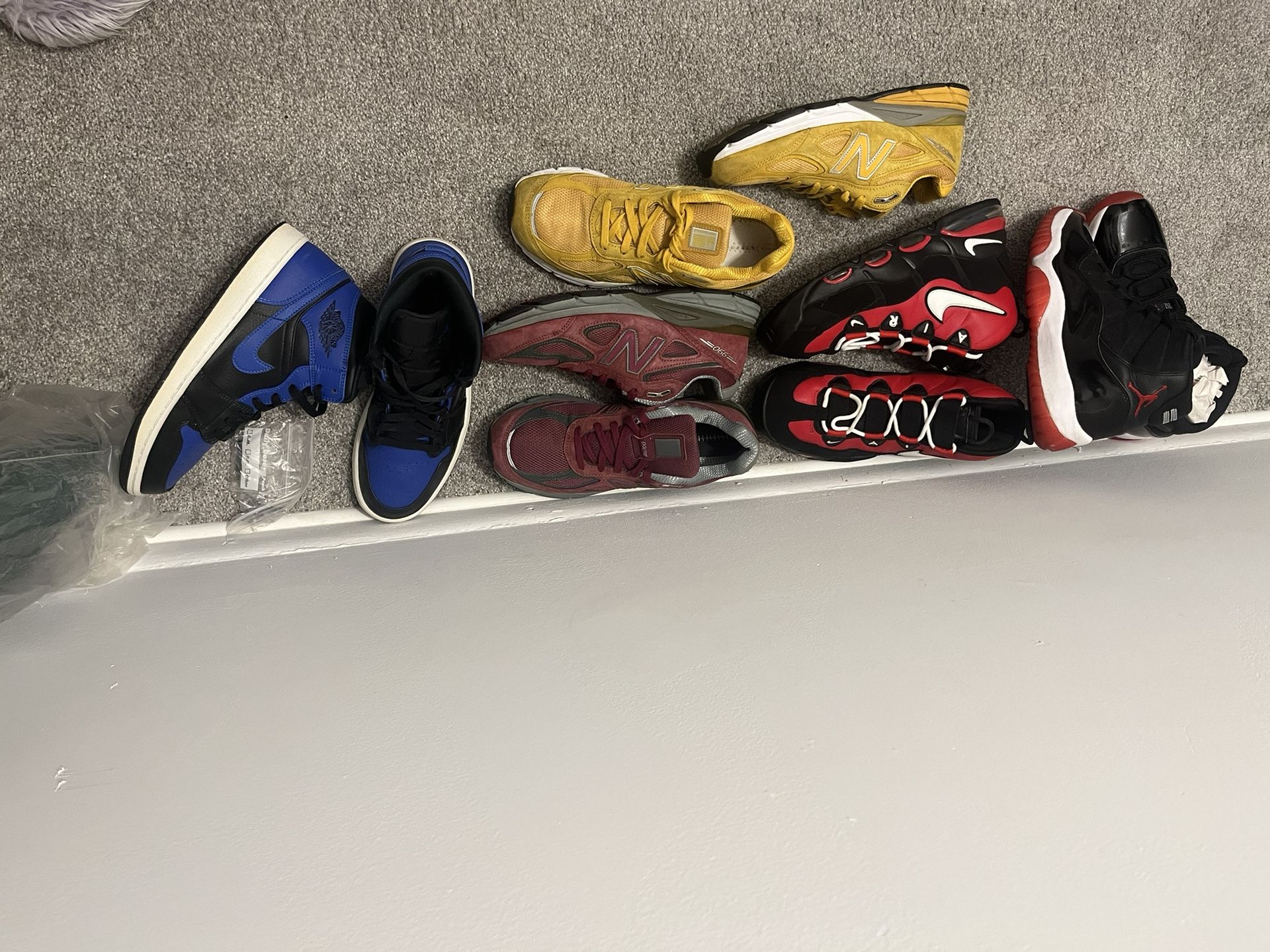 Men..size 9.(the red & Black Jordan’s 11s Sold) R&B Pittman9.5 $100.00) New Balances Burgundy, $75 And Gold ones are $75.. Both size 9 for $140.00..