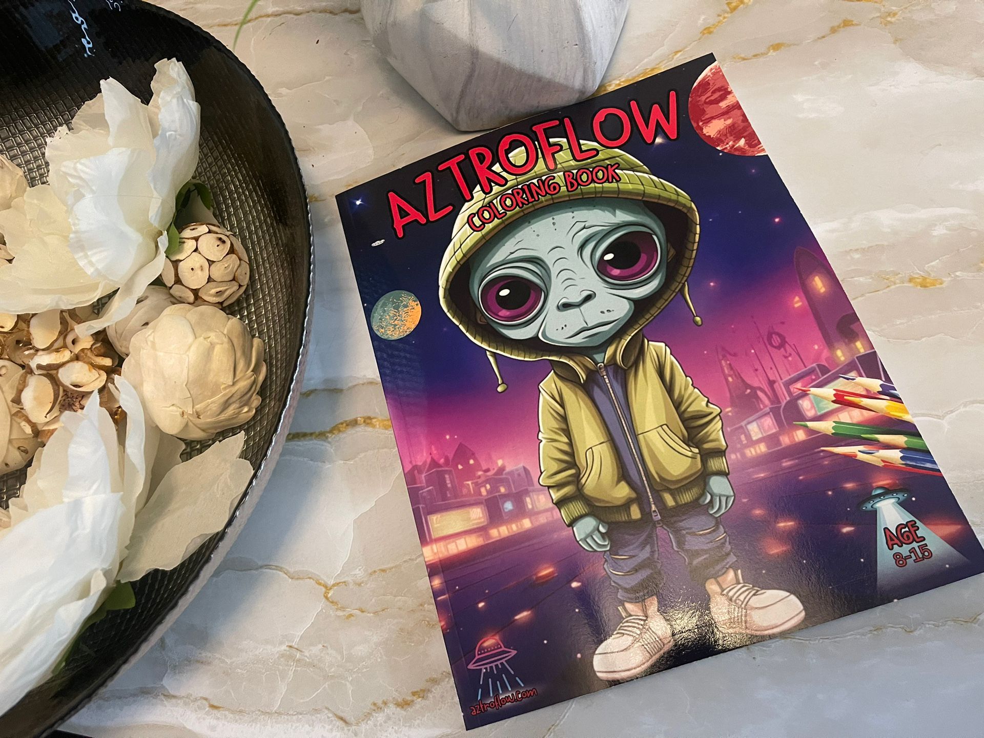 Coloring Book 8.5x11'' 80 Pages Black and White Coloring Images, Some Pages Contain Dark Backgrounds. The Aztroflow Coloring Book takes young artists on an extraordinary journey through a fusion of cosmic realms and urban landscapes. Filled with captivating illustrations of friendly alien characters, vibrant cityscapes, and intricate patterns, this coloring book invites children to unleash their creativity and explore a world where imagination knows no bounds. With each page waiting to be filled with vibrant colors, the Aztroflow Coloring Book sparks joy, ignites artistic expression, and nurtures a love for both cosmic wonders and urban style. Whether it's bringing a cosmic creature to life or adding flair to a bustling city scene, this book provides endless opportunities for young artists to embark on a colorful adventure and create their own cosmic masterpieces.