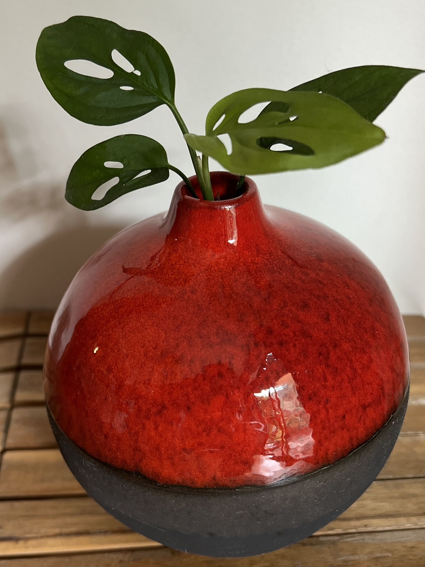 Healthy swiss cheese monstera plant start in a beautiful red and charcoal grey vase. Any questions about this item or any of my other listings please feel free to ask :) Thank you! Dimensions: *Plant - 4” *Vase - 6”tall x 5”wide
