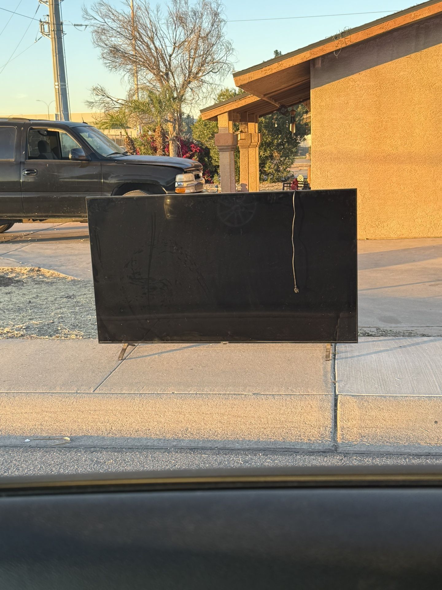 Remote controller was tossed at the TV bottom right corner screen. Turns on then goes black if you could fix it it’s all yours.