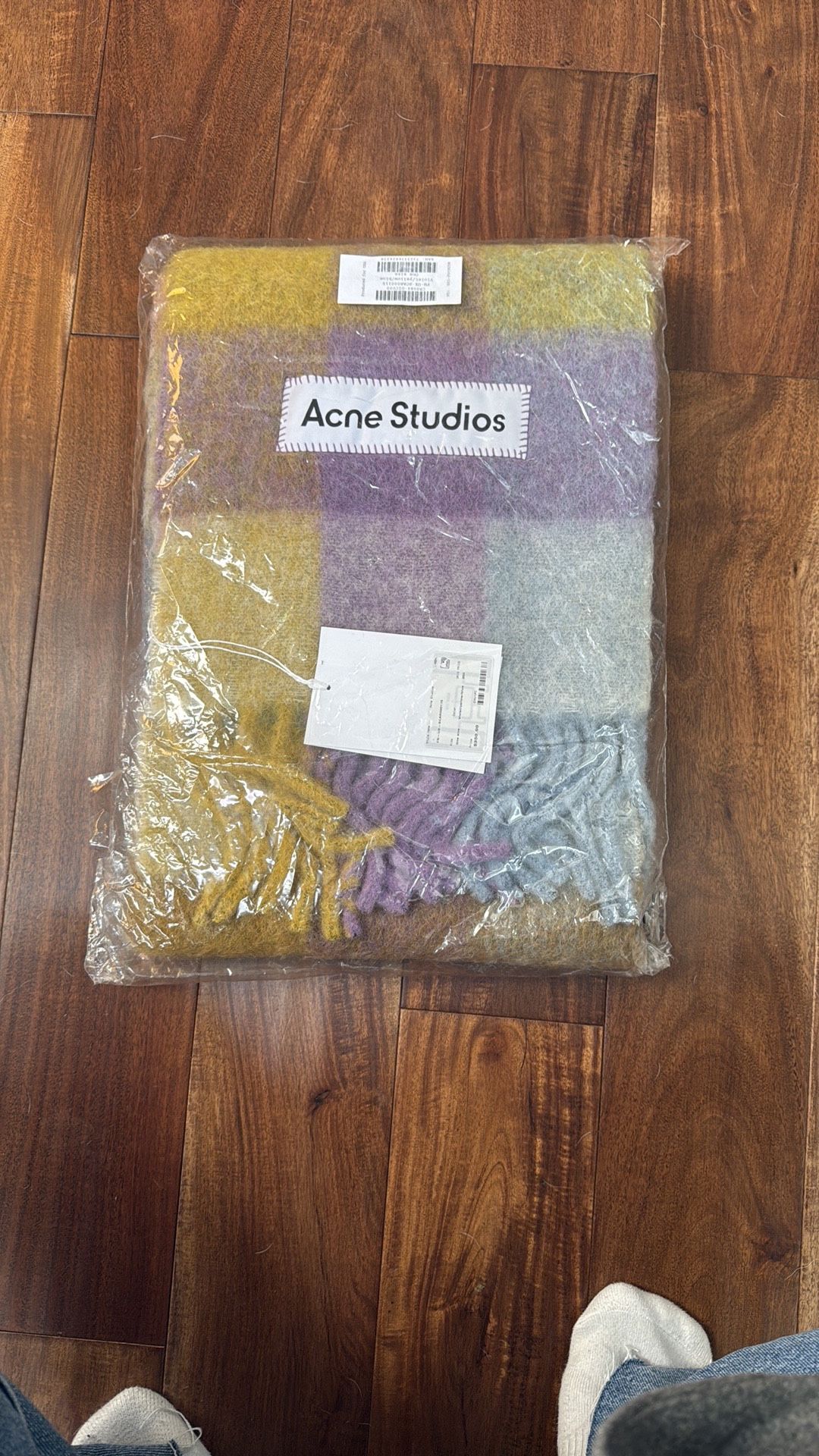 Acne Studios Plaid Alpaca, Wool & Mohair Blend Scarf with a gradient of yellow, purple, and blue. Authentic & brand new with tag