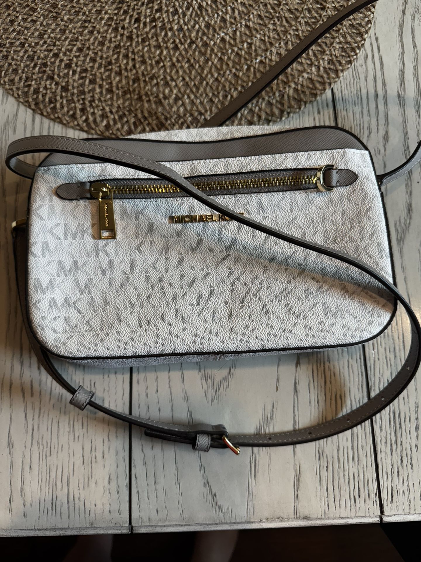Beautiful white grey and gold MK bag. Never used, was given as a gift but it was not my style. Great purse no damages.