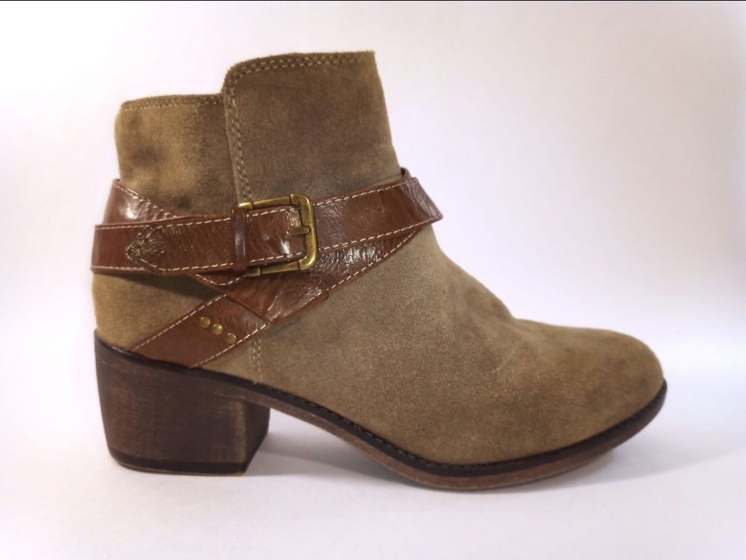 DESIGN Suede upper. Rubber outsole. Cushioned insole. Lined with soft padding. Almond toe. PU Straps with buckle accent, gold tone hardware, and 3 studs. Instep zipper closure. 2" block heel. 3.75" shaft. When I was taking photos, the color reminded me of russet potatoes. CONDITION New without box. Clean has a small, light shoe glue spot seen in 7th picture. It looks like there is damage in the 6th picture but it's just the direction of the suede. You'll see in 7th picture that it is fine. Marker ink on outsole. Will wear off with some use. Smoke-free, stored away from pets. Brand: White Mountain Color: Tan Style: Yonder Size: 9 Retail: $90 π» Pick up in Lake Forest. (Trabuco/Lake Forest Dr.) No holds (without deposit or payment). No personal delivery included. May consider delivery locally for a small fee. π¦ Shipping available. Just message me with your zip code for a discounted shipping quote. IF IT'S UP, IT'S AVAILABLE β Let me know when you'd like to make this yours.