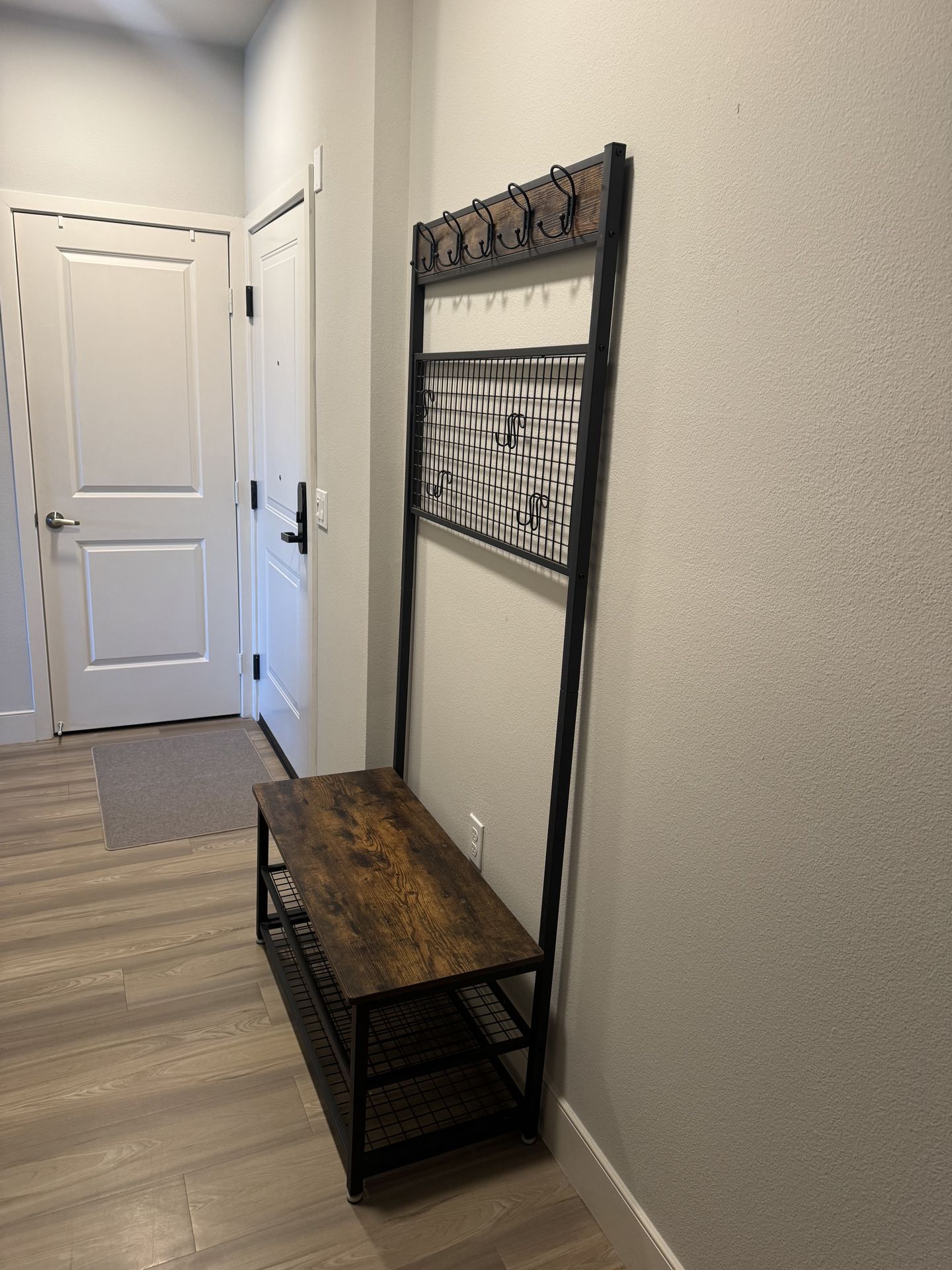 Stylish hall tree. Has coat hooks on top and a mesh grid with S-hooks. Bench provides a spot for sitting or bags. Two wire shelves below for shoes. Industrial rustic vibe. Good for entryway organization. 5 hooks on top 4 small hooks that are moveable on lower rails. 74H x 36W x 15.5D