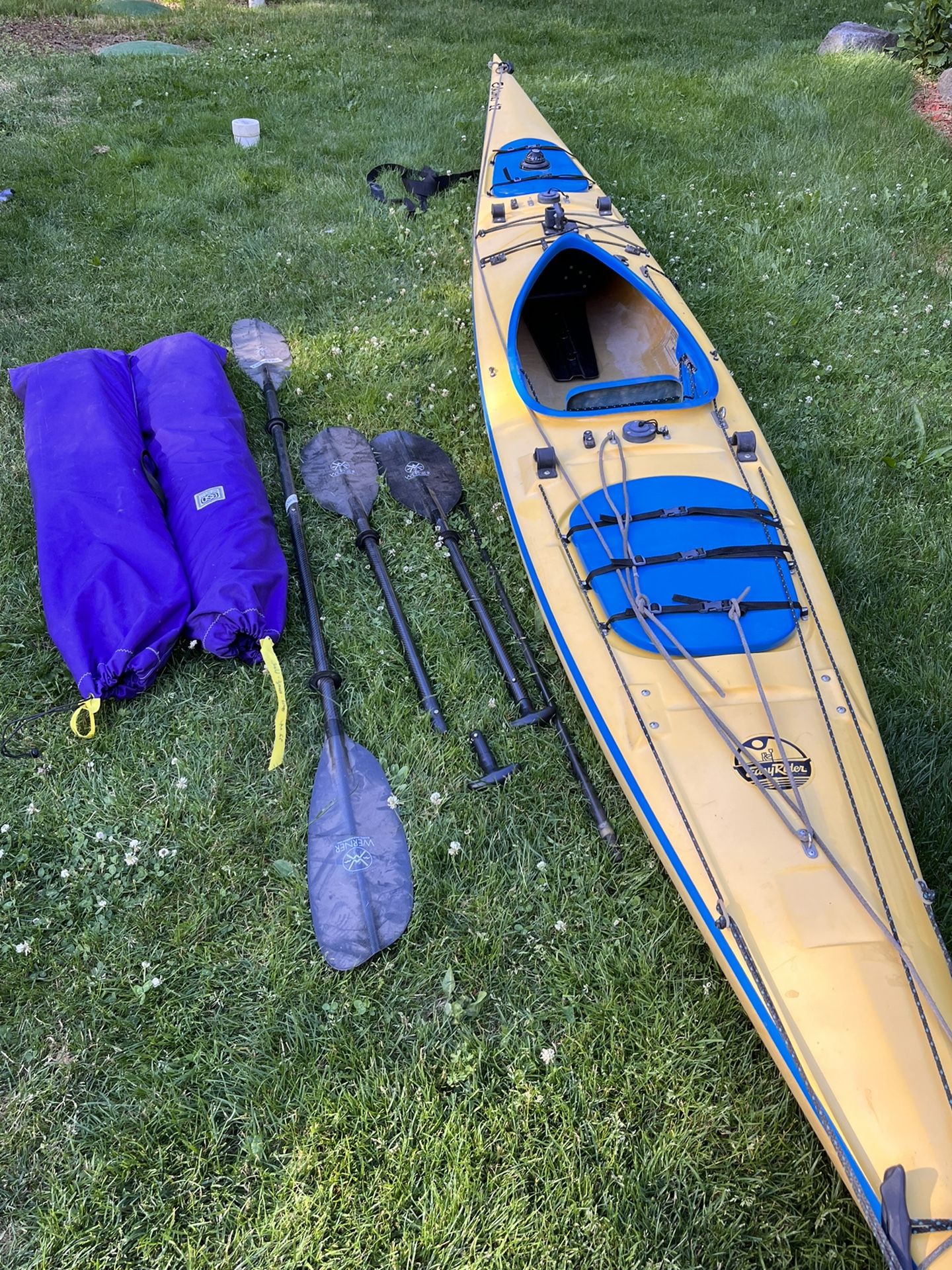 I have this sea kayak that has been stored in my garage for the last 11 years. My dad bought it new from the Easy Rider store in Tukwila and it has approximately 5 years of use on it. 2 spray skirts 4 foam block carriers 1, 32 inch BSD Batwing Sail with a leeboard-new For everything I would like $1200. Serious inquiries only please.