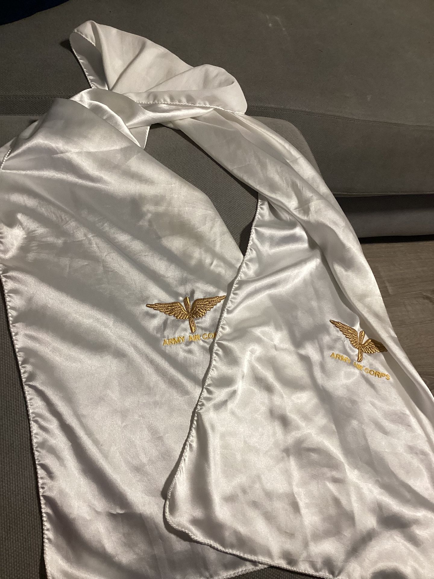 All monies used buy new clothes new toys children in need in FL why pay more Like New gently used worn about the condition Brand Epic Militaria Color White Department Unisex Type Scarf Style Scarf Material Silk Blend MPN Does Not Apply UPC Does not apply Country of Origin United States Description folded keep postage rate down WW2 US Army Air Corps Pilots Scarf Quality reproduction of the type of scarves used by US Army Air Corps Aviators both before and during the Second World War. These scarves are made with a 75% polyester, 25% single ply silk blend and have the Army Air Corps emblem embroidered neatly to each end of the scarf. Each scarf measures approx. 70 inches x 13 inches.