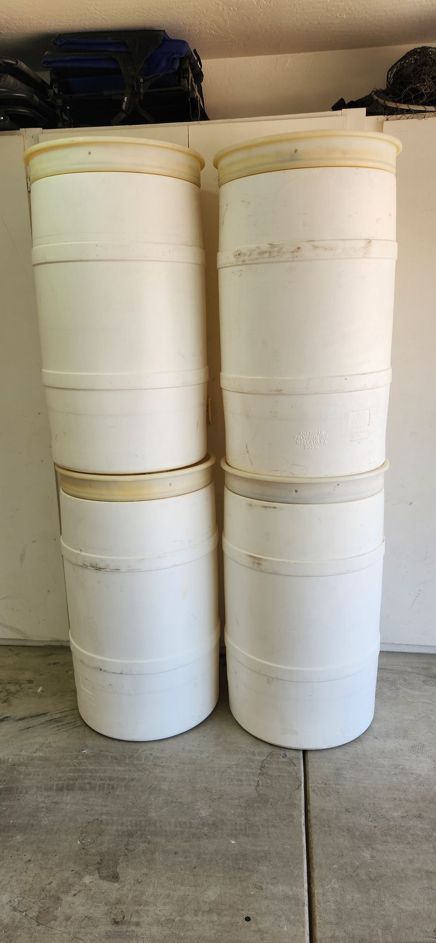 Plastic poly fifty five gallon barrels. I have 3 left to sell at $15 each. 3 for $40. We used them for water storage , but don't need them in the future. 24" wide and 40" tall. Threaded plugs included. Lids are not removable so no leaking.