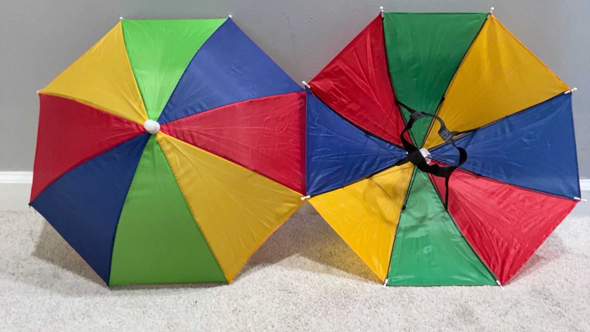 Gently used pair of vibrant rainbow umbrellas with red, blue, green, and yellow panels—perfect for brightening up rainy days! Compact design folds small for easy carrying (about 10 inches closed), opens to around 24-30 inches diameter. Sturdy frame, and in excellent condition with no tears or issues. Great gag gift or fun for kids/travel. From a pet-free, smoke-free home. Local pickup preferred, or can meet nearby. Asking $8 OBO—bundle deal!
