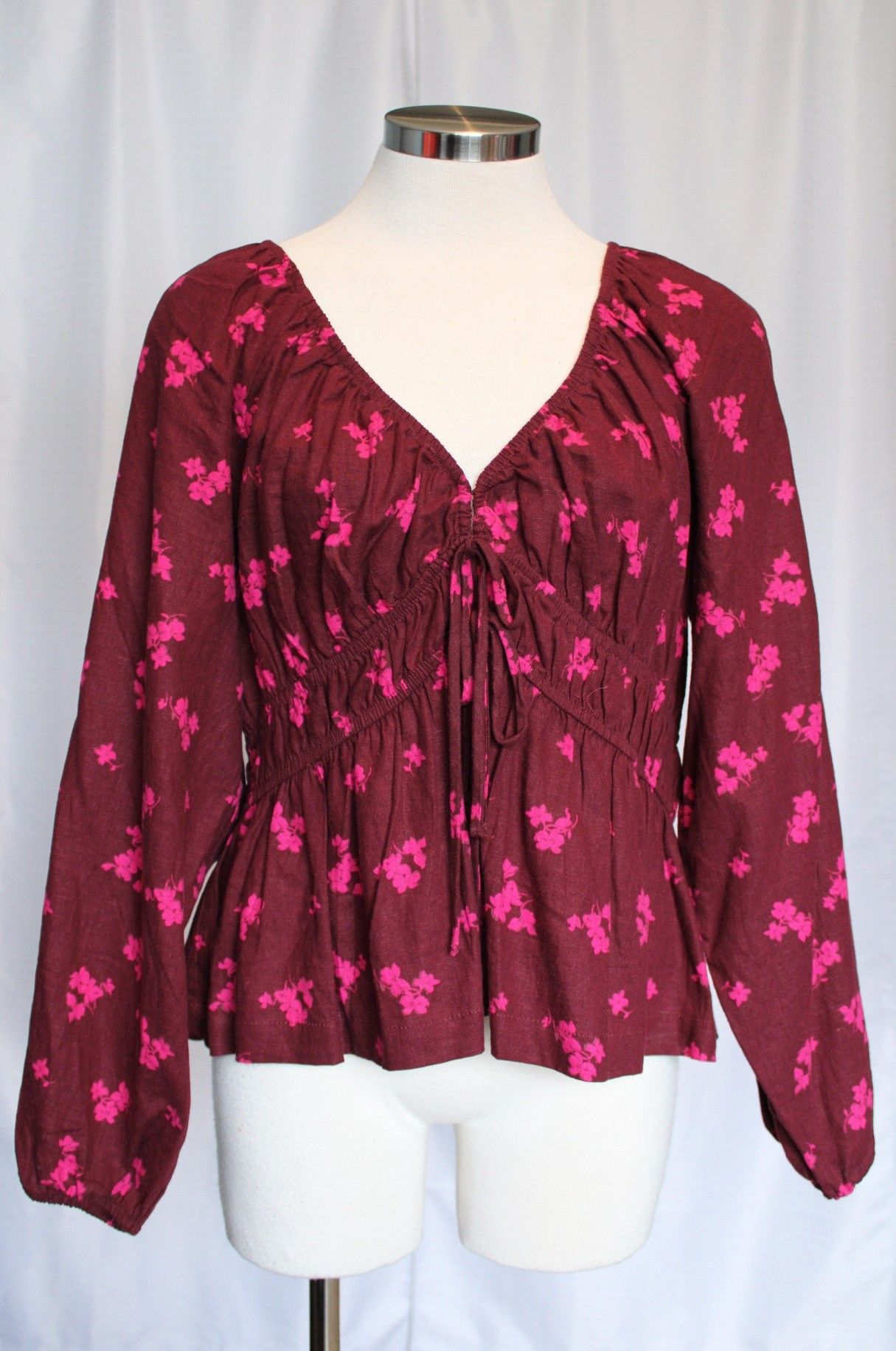Brand new with tags Universal Thread long sleeve floral top in a rich pink and purple print. Lightweight fabric with a flattering v-neckline and feminine gathered detailing at the bust. Elastic band at the sleeves for a subtle balloon effect. Details: • Size: Large • Color: Pink and purple floral • V-neck • Long sleeves with elastic cuffs • Pullover style • Lightweight, flowy fit • MSRP $25 Measurements (approximate, laid flat): • 21" pit to pit • 23.5" length • 18" sleeve inseam Great everyday blouse for casual wear, work, or layering in fall and spring.
