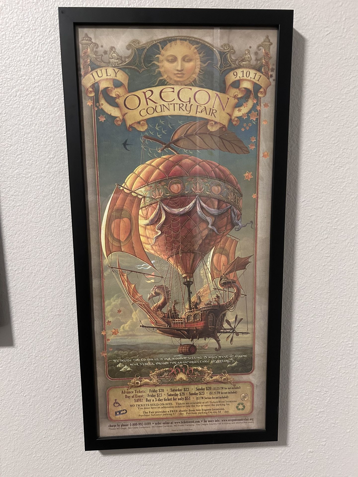 It’s a 2010 Oregon country fair poster for sale. It was professionally framed by luke’s frame shop in Portland, Oregon. It’s an excellent condition.