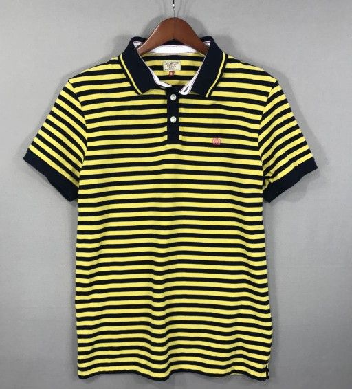 Men's Medium. Yellow/Blue Striped. 100% Cotton. No holes or odors. Small imperfections on left sleeve. Please see pictures. Pre-Laundered, ready to wear. Smoke free home. Measurements (approximate) inches with clothing flat and not stretched. Chest: 20" Length: 28" Sleeve: 8" Fast Shipping with 1 Day or Less Handling Time. Thank you for viewing and feel free to message with any questions or offers.