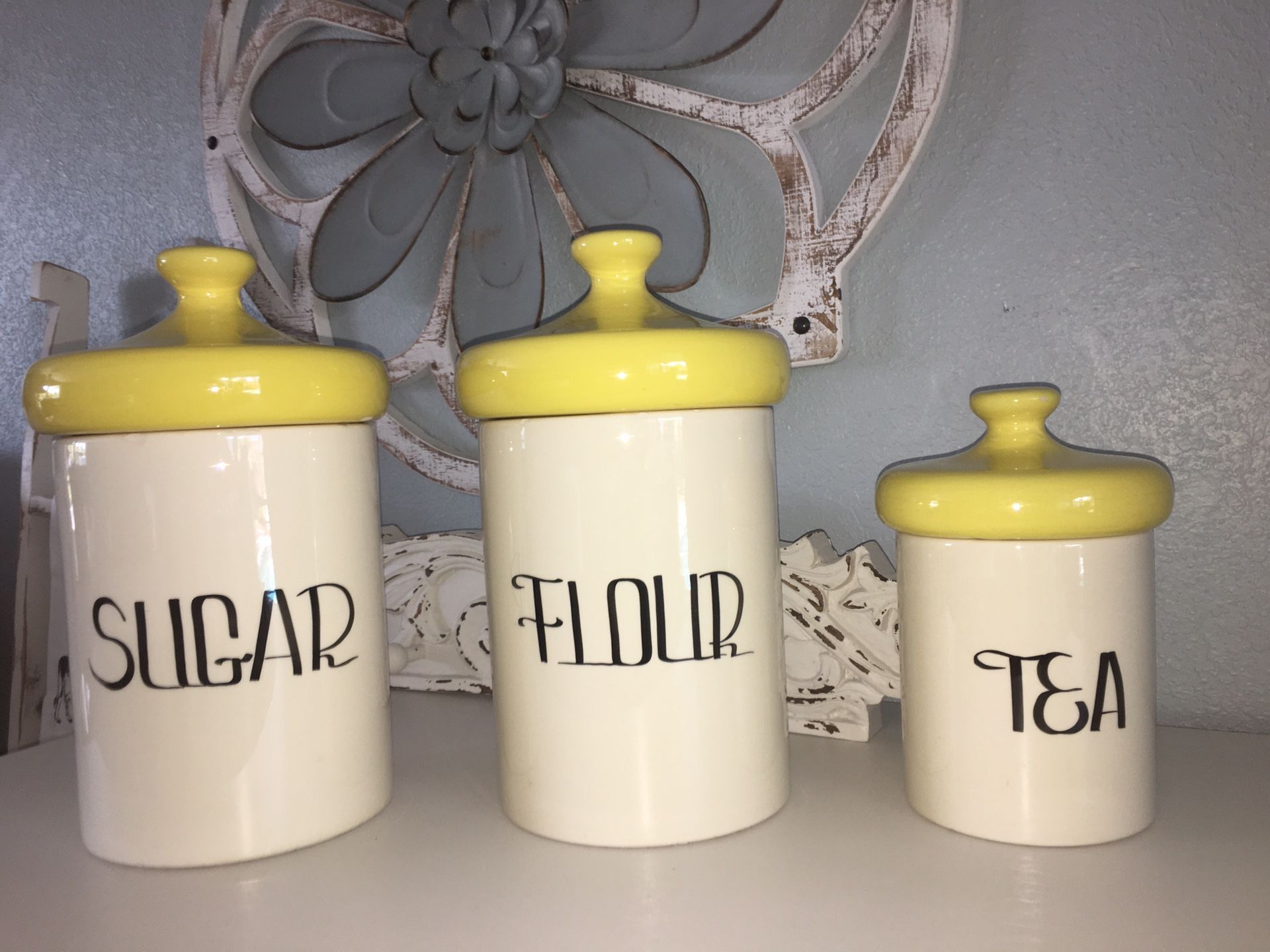 Fabulous set of 3 mid century modern kitchen canisters in off white ceramic with vibrant yellow lids. This cool set of canisters is quite large with the flour and sugar holding over five pounds each. All three in excellent condition, no chips or cracks. The Flour and Sugar canisters measure 6.75" in diameter by 13" tall, and tea canisters is 5 1/4" in diameter and 9" tall. less, fcfs