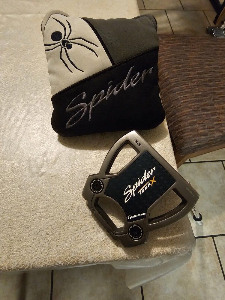 This is a right handed Taylormade Spider Tour X 35 inch golf club putter. Spider Tour Series Putters. THIN WALL UNDERCUT CONSTRUCTION- We’ve engineered a super stable structure by removing excess weight to create high MOI and legendary Spider performance. STEEL WIREFRAME- Allows engineers to better control weight distribution and CG location. HYBRAR ECHO DAMPENER- HYBRAR is behind the face to dampen unwanted vibrations, delivering premium sound and feel on every putt with the best possible sensation. DIFFERENT CG LOCATION- Each Spider Tour model features different CG locations for optimal putter fitting. TSS WEIGHTING- TSS weights provide balanced weighting and help optimize performance for all various putter lengths. GUNMETAL PVD FINISH- The durable PVD coating creates a beautiful high-quality finish. TRUE PATH ALIGNMENT- The patented alignment system provides visual clarity and helps golfers better envision the line to the hole. WHITE TPU PURE ROLL INSERT- Made from a combination of Surlyn and aluminum, the white TPU Pure Roll insert creates a softer feel. Grooves are angled at 45° to encourage optimal forward roll as well as better sound, feel and overall roll characteristics. The white insert also creates better symmetry with the white True Path alignment. REFINED HOSEL DESIGNS- Spider Tour Series includes two different hosel shapes and designs. The small slant produces toe hang, and the double bend produces a face balanced design. This is a awesome putter!